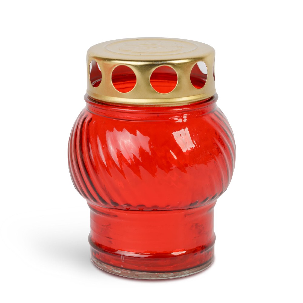 Această lumânare clasică din sticlă roșie este un simbol al reculegerii și respectului, potrivită pentru comemorări, sărbători religioase sau vizite la cimitir. Recipientul din sticlă oferă un aspect elegant și tradițional, iar capacul metalic auriu protejează flacăra și o face mai rezistentă la vânt.