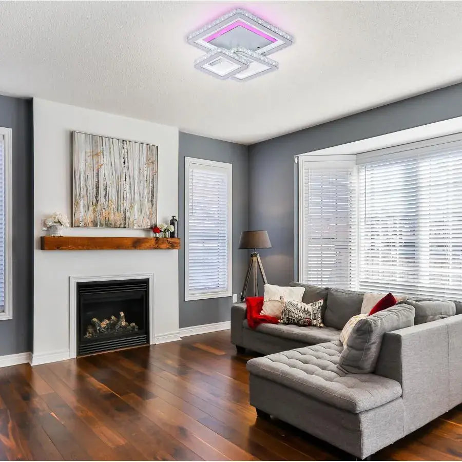 Lustra LED cu telecomanda si cristal LEILA 154W, 3 Patrate, lumina Rece/Calda/Neutra, Dimabila, Alb Crom Lucios ModernLight Concept