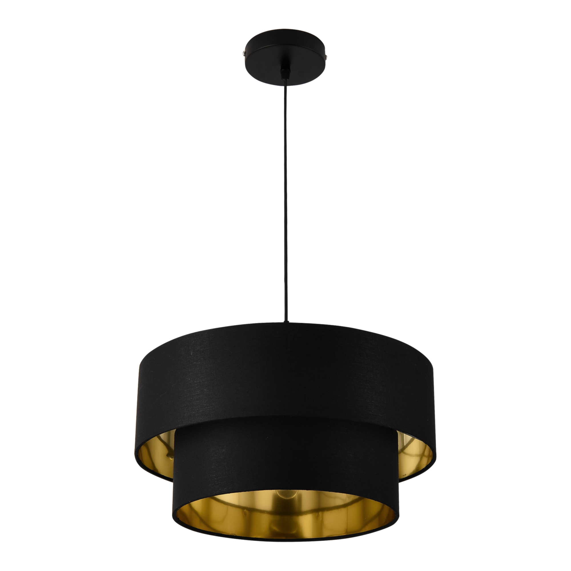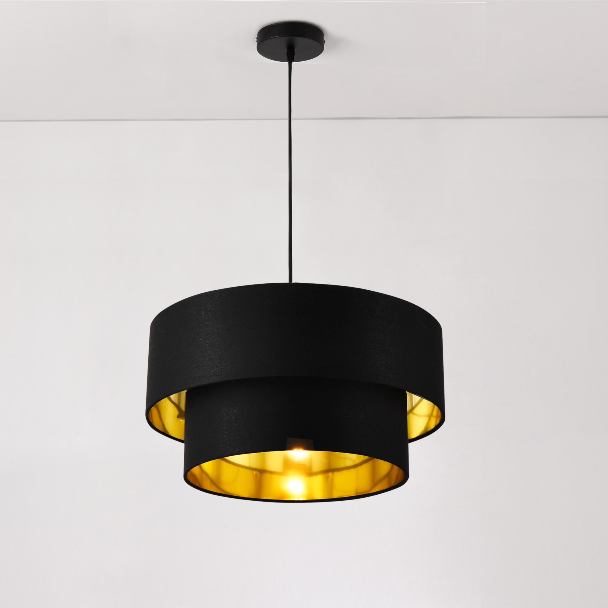 Această lustră neagră cu interior auriu este ideală deasupra mesei, într-un colț de relaxare sau în zona de zi, unde poate deveni rapid punctul central al decorului. Se acționează prin întrerupător de perete și este compatibilă cu un bec de maximum 60W.