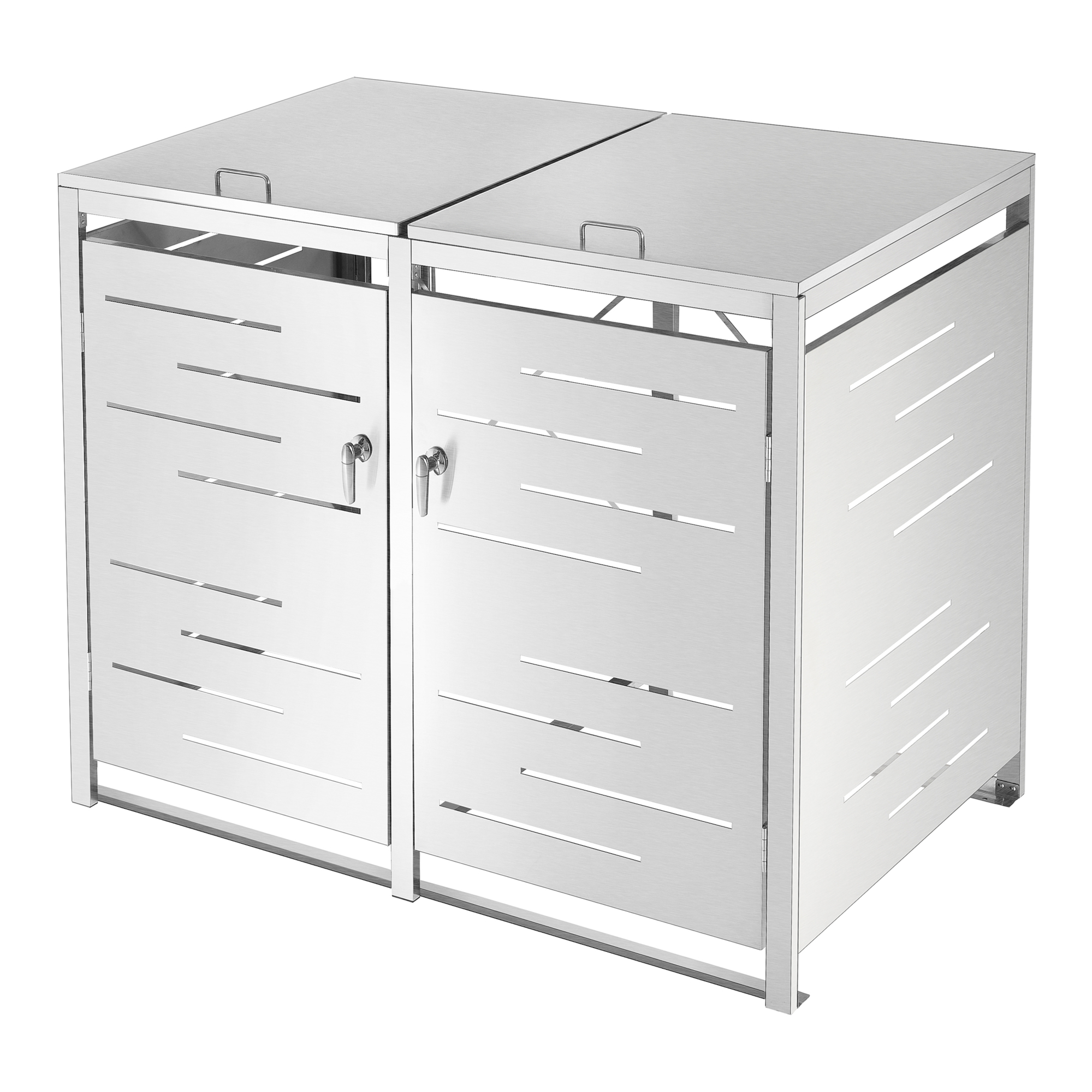 Aceasta magazie din otel inoxidabil, rezistenta la intemperii va masca discret cosul de gunoi. Se poate incuia, astfel cosurile sunt protejate imppotriva celor iresponsabili.In plus aceasta magazie-masca va proteja cosurile impoptriva razelor de soare si a apei.