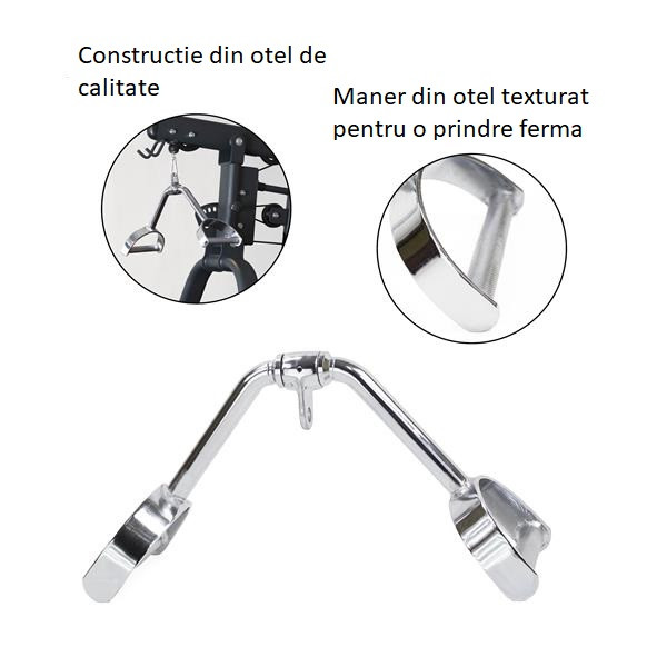 Constructia manerului garanteaza pozitia perfecta a mainii si forteaza miscarea corespunzatoare. Distanta larga dintre manere va permite sa efectuati exercitii intr-un unghi alternativ cu prinderea ingusta. Va da posibilitatea unui antrenament mai eficient si a unei dezvoltari complete a grupelor musculare. Manerul din otel cu texturare impiedica alunecarea acestuia din maini, dar in acelas timp va ofera posibilitatea unei prinderi ferme. Datorita acestui lucru, lucram si la dezvoltarea muschilor antebratului. Manerul este realizat din otel de calitate. Acest lucru va permite sa va antrenati cu o greutate semnificativa.