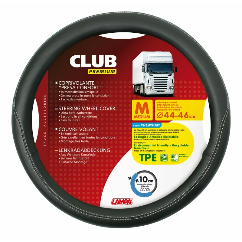 Mansonul de volan pentru camion Club Premium este alegerea potrivita daca iti doresti mai mult confort, aderenta sigura si un aspect ingrijit pentru interiorul cabinei. Realizat din material moale, cu aspect de piele, acest husa volan camion ofera o prindere excelenta in timpul condusului, in orice conditii, si se monteaza usor.