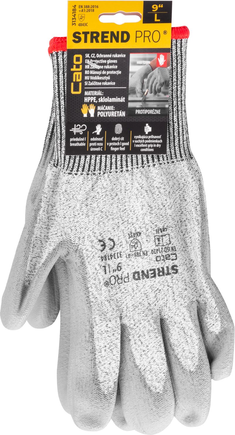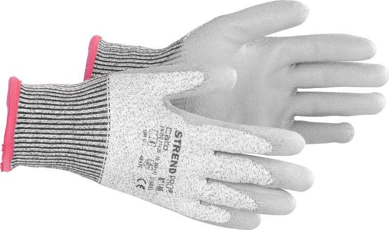 Mănușile Strend Pro Cato sunt mănuși antităiere fără cusături, concepute pentru protecția mâinilor la lucrări cu risc mecanic. Sunt realizate din tricot 13G HPPE cu fibră de sticlă, oferind o rezistență foarte bună la abraziune și tăiere. Palma și degetele sunt acoperite cu un strat de poliuretan (PU) gri, pentru control sigur al sculelor și pieselor.