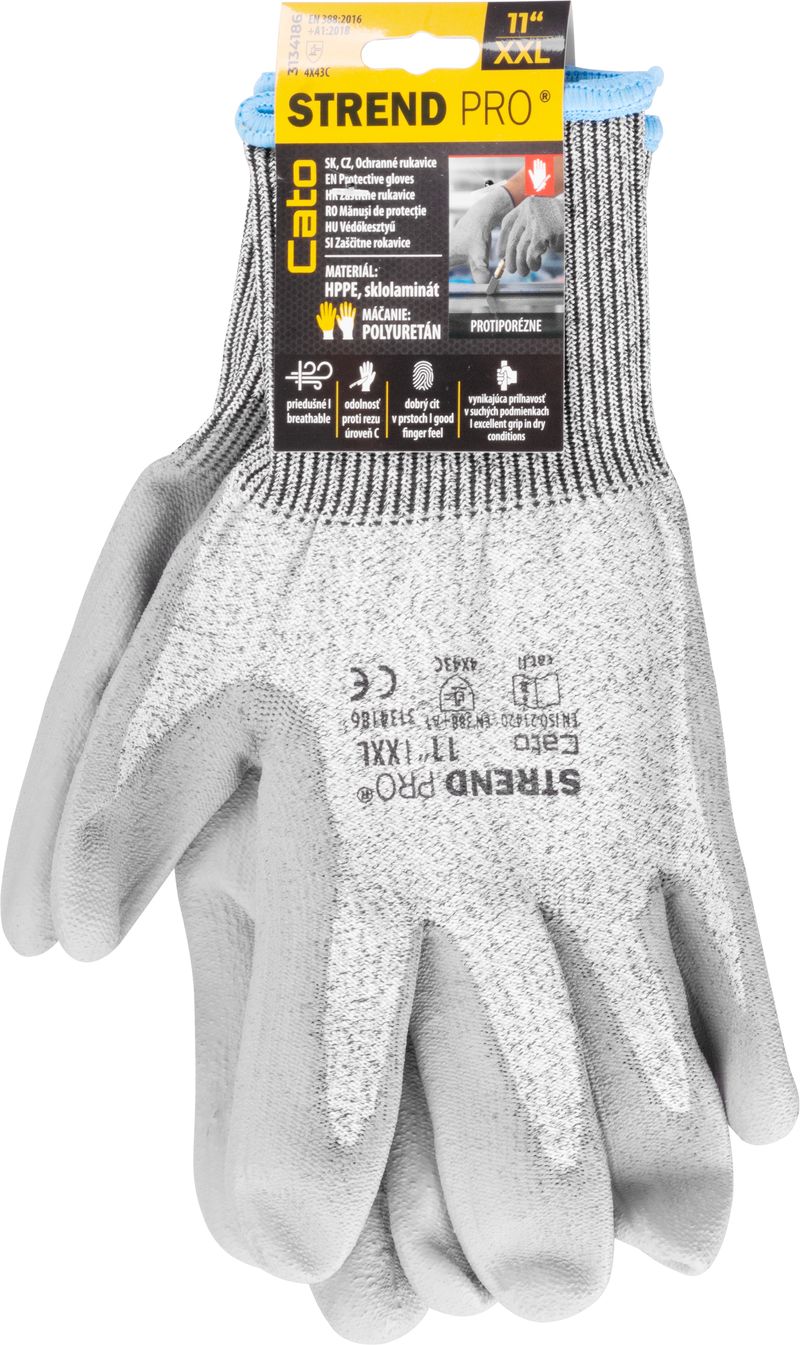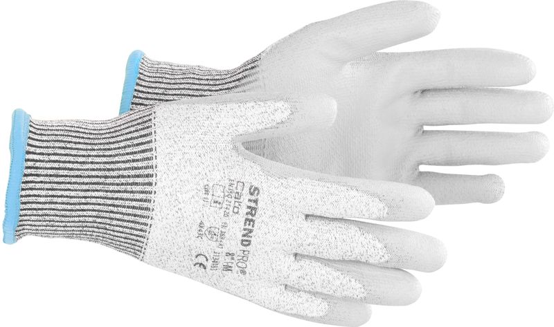 Mănușile Strend Pro Cato sunt mănuși de protecție antităiere fără cusături, realizate din 13G HPPE și fibră de sticlă, concepute pentru o rezistență foarte bună la abraziune și tăiere. Palma și degetele sunt acoperite cu un strat de poliuretan (PU) gri, pentru o priză sigură și control bun la manipulare.