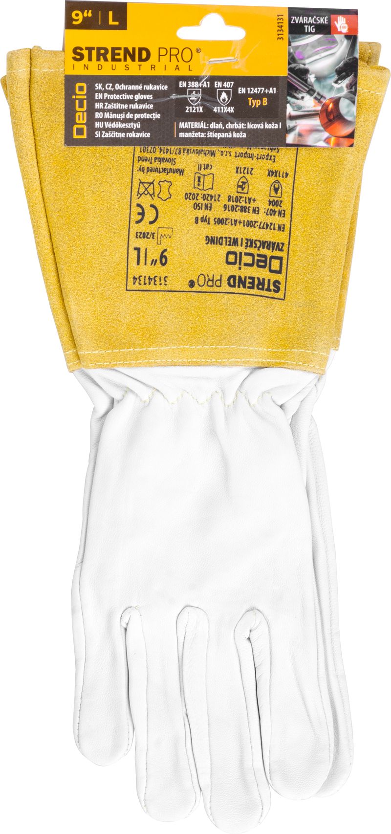 Mănușile Strend Pro Industrial Decio sunt mănuși profesionale pentru sudură TIG, realizate din piele integrală pentru confort, flexibilitate și protecție în timpul lucrului. Palma și dosul sunt din piele de capră albă, iar manșeta cu elastic este din șpalt de bovină, pentru o protecție suplimentară a încheieturii și antebrațului.