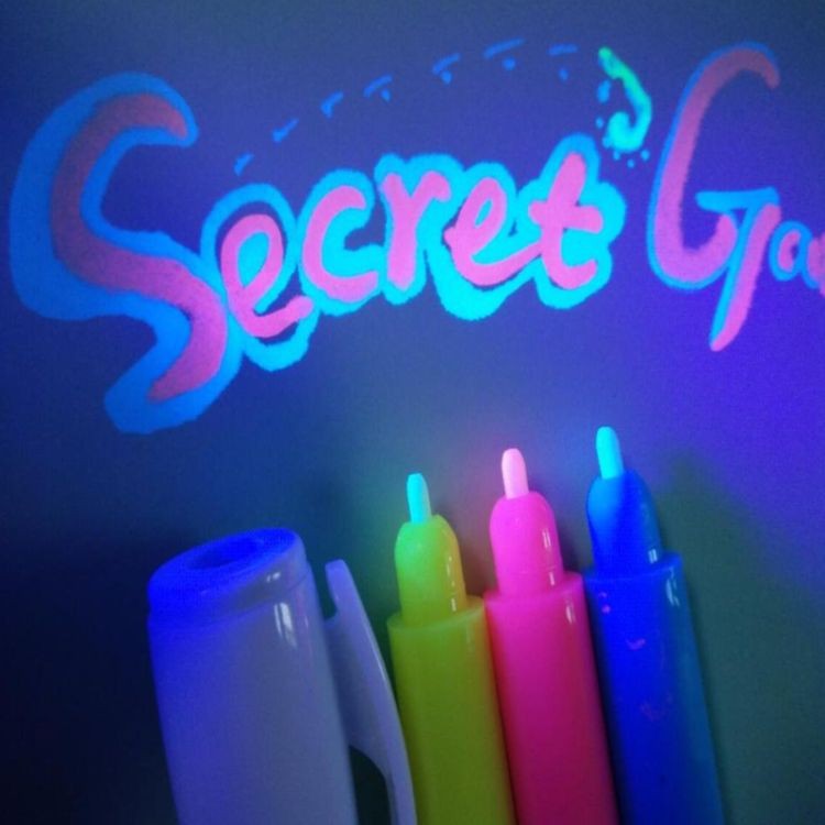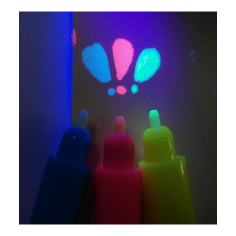 Invizibil la lumina normala scrisul sau insemnul efectuat de acest marker apare sub culoarea rosu, verde sau albastru fluorescent sub lumina UV incorporata in capacul acestui marker.