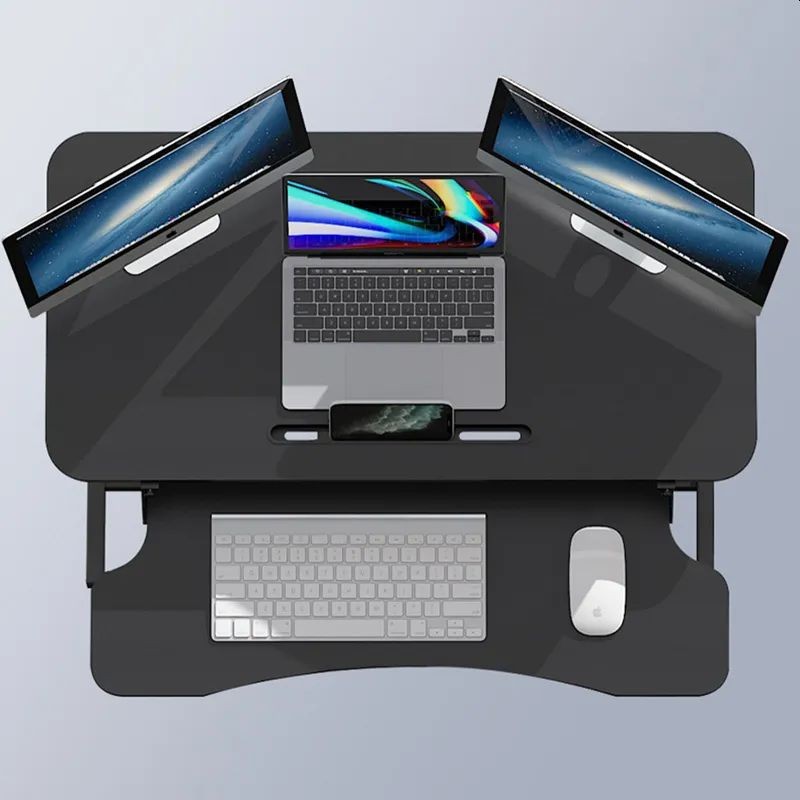 Masa dispune de o suprafata de lucru cu o dimensiune generoasa de 80 x 40 cm si poate gazdui simultan mai multe monitoare sau laptopuri, sporind astfel productivitatea. Blatul este prevazut cu un slot pentru smartphone sau tableta, pentru a avea la indemana toate gadgeturile necesare. In partea inferioara este echipat cu un suport pentru tastatura si mouse care se ridica sincronizat cu partea superioara.