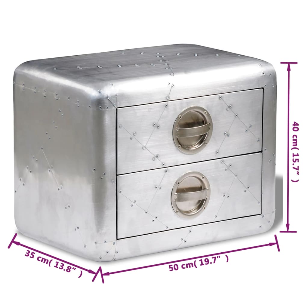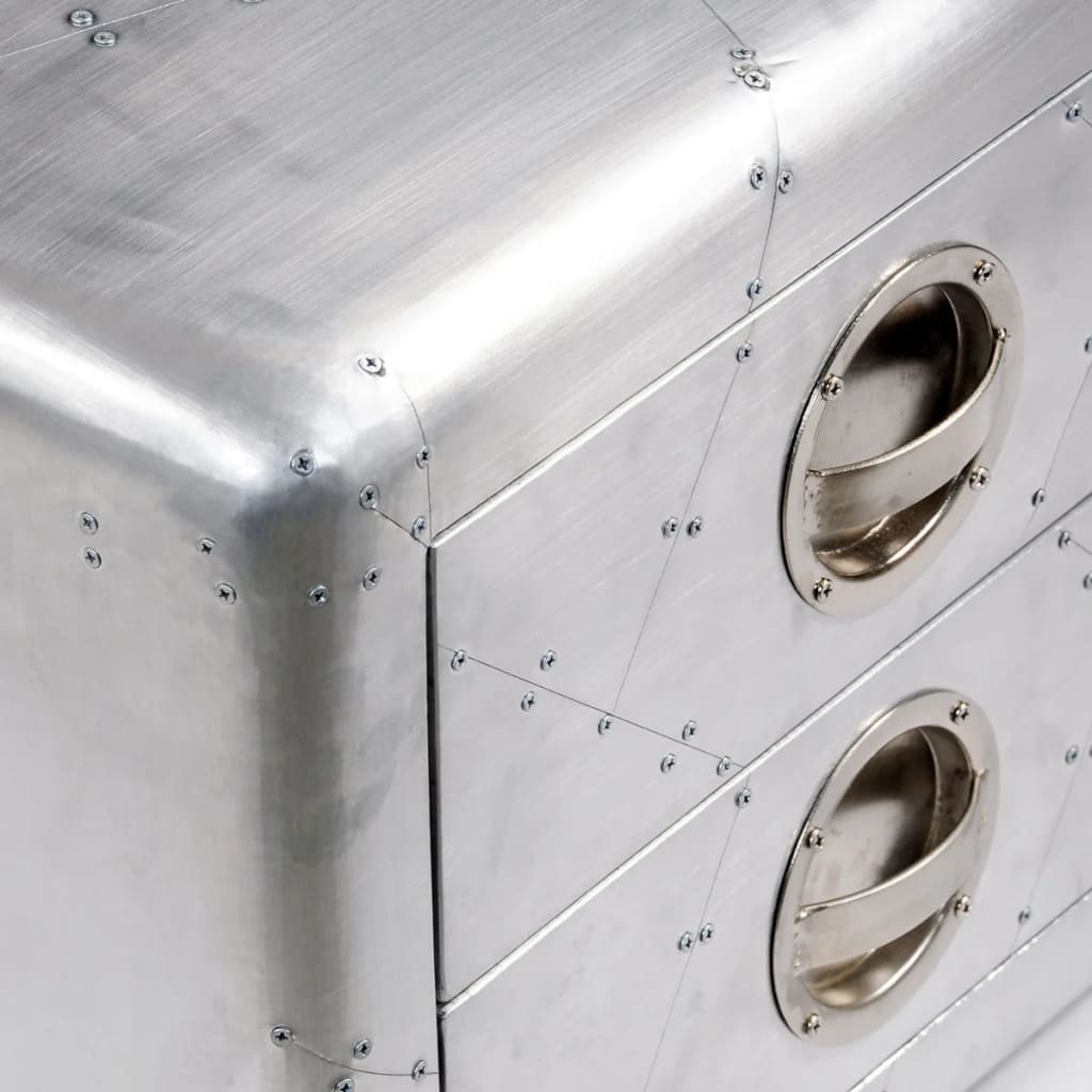 Această masă laterală în stil aeronavă este fabricată din lemn masiv, iar suprafața acesteia este îmbrăcată cu un mozaic de panouri din aluminiu lustruit, decorat cu șuruburi din oțel vizibile, ce îi asigură durabilitate. Muchiile netede și mânerul sertarului retro oferă un aspect unic măsuței laterale tip aviator .
