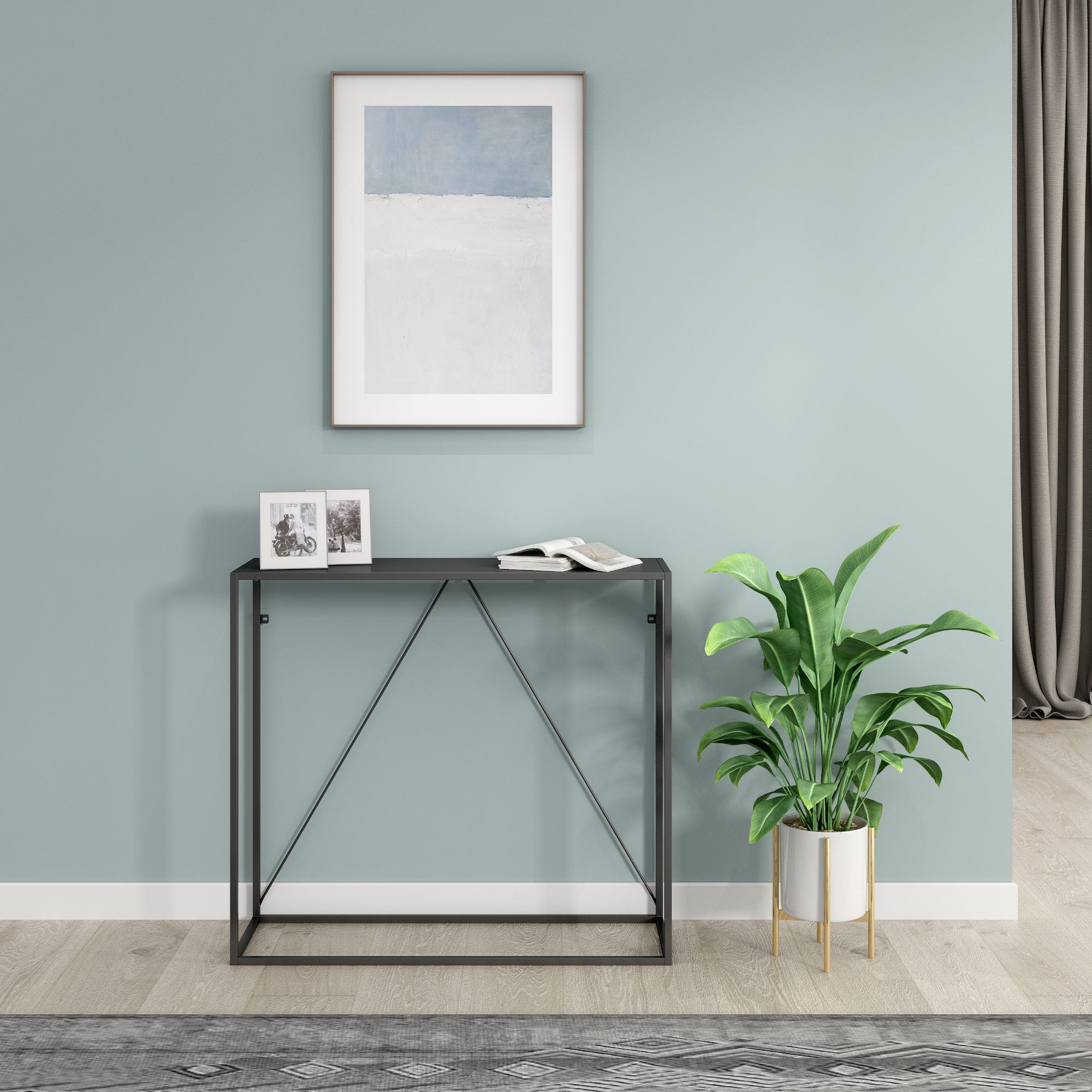 Datorită designului minimalist și structurii din metal, produsul se integrează ușor în decoruri contemporane, industriale sau simple. Poate fi folosită ca masă pentru hol, suport decorativ în living sau mobilier de accent într-un coridor îngust, unde spațiul trebuie valorificat eficient.
