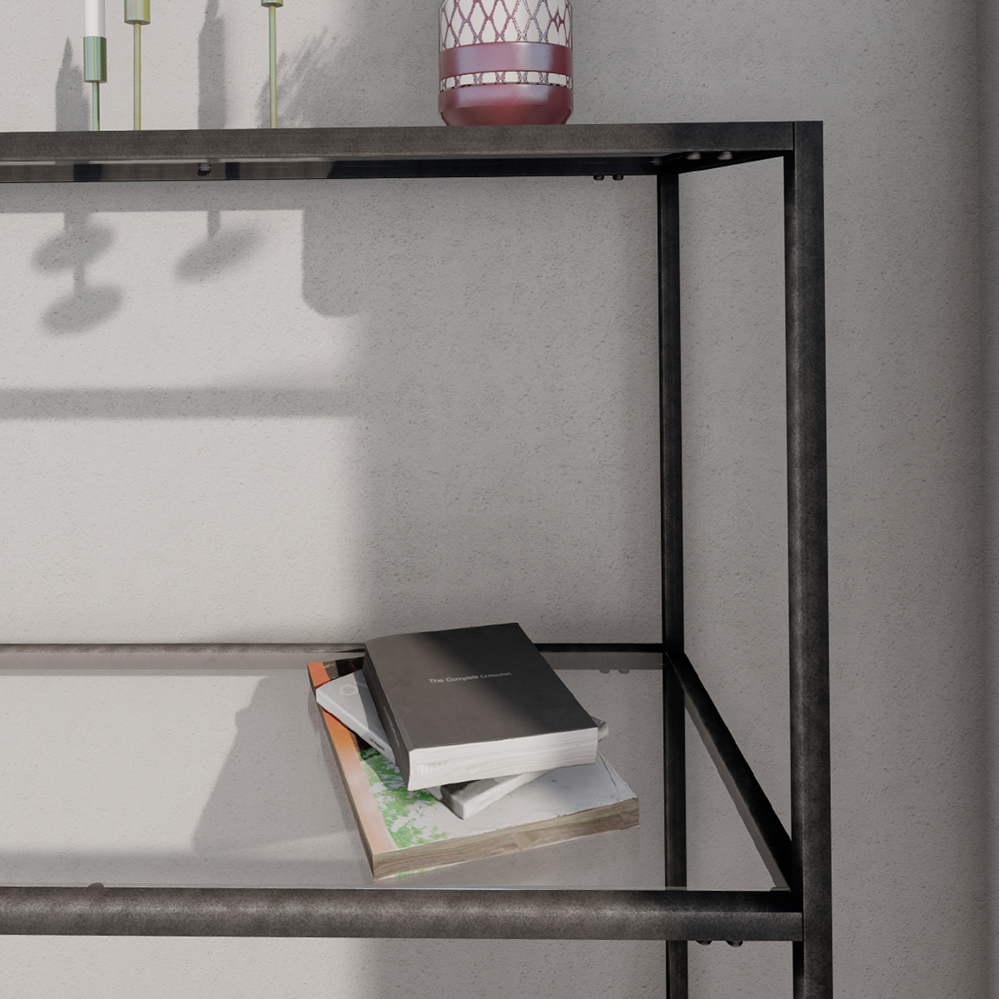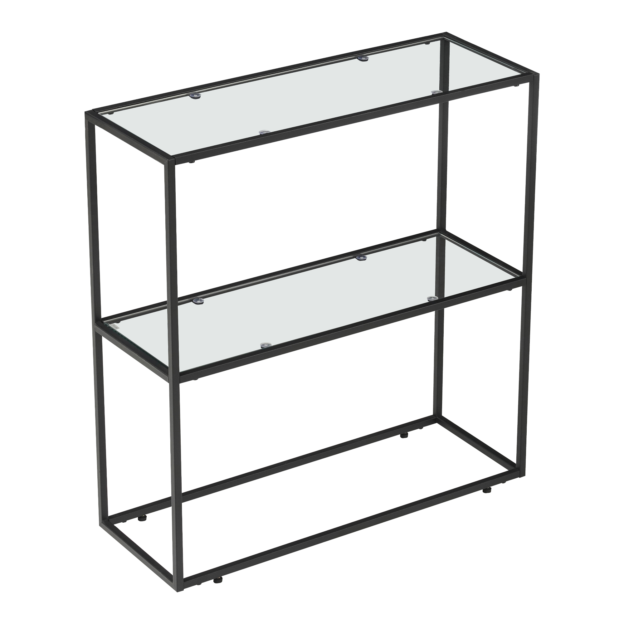 Masă consolă Konnevesi este o piesă de mobilier modernă și practică, potrivită pentru hol, living sau orice colț al casei în care ai nevoie de un plus de stil și organizare. Designul său minimalist, cu cadru metalic negru mat și polițe din sticlă securizată, oferă un aspect elegant și aerisit.