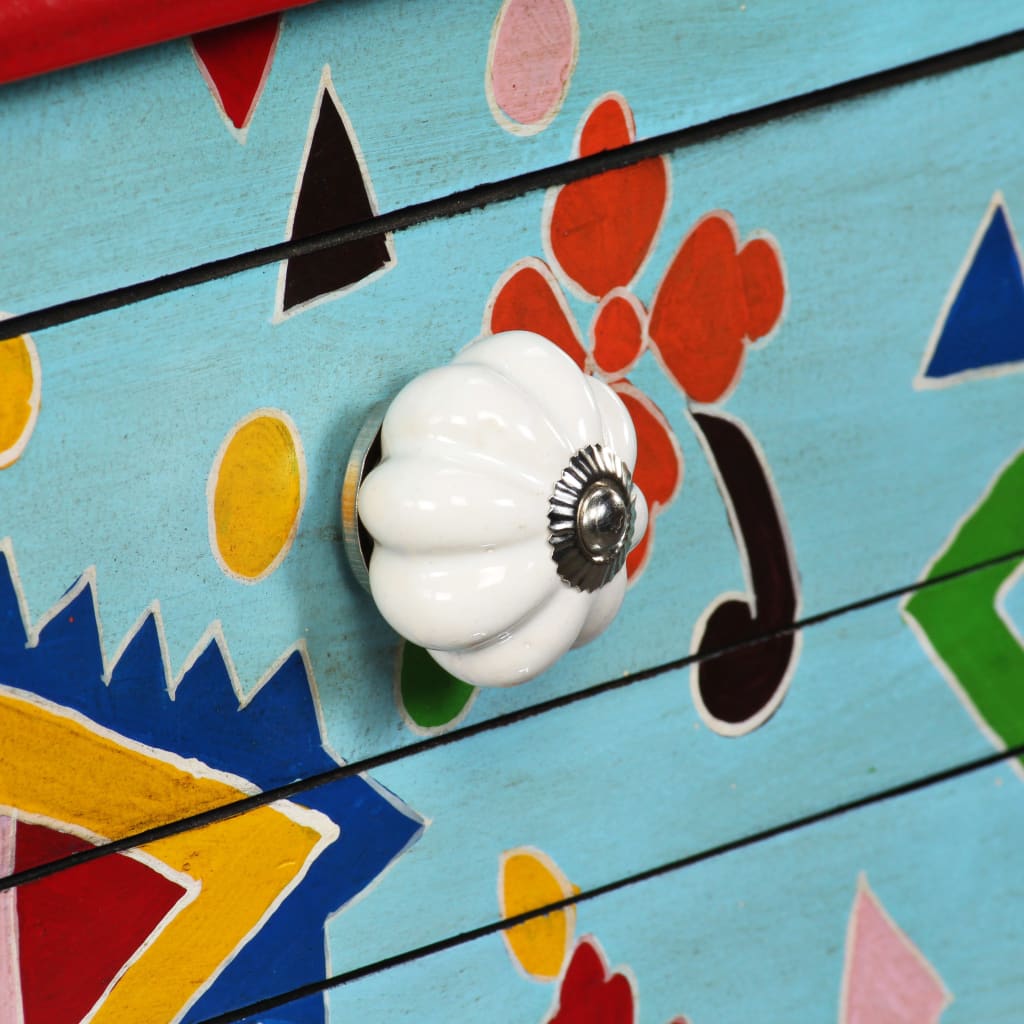 Masa este realizată manual din lemn de mango, care este atât durabil, cât și frumos, iar măiestria se adaugă stilului său retro spectaculos. Masa prezintă detalii decorative bogate, pictate manual, care emană o notă de eleganță și evidențiază aspectul rafinat. Mânerele distinctive facilitează deschiderea sertarelor și completează stilul mesei.