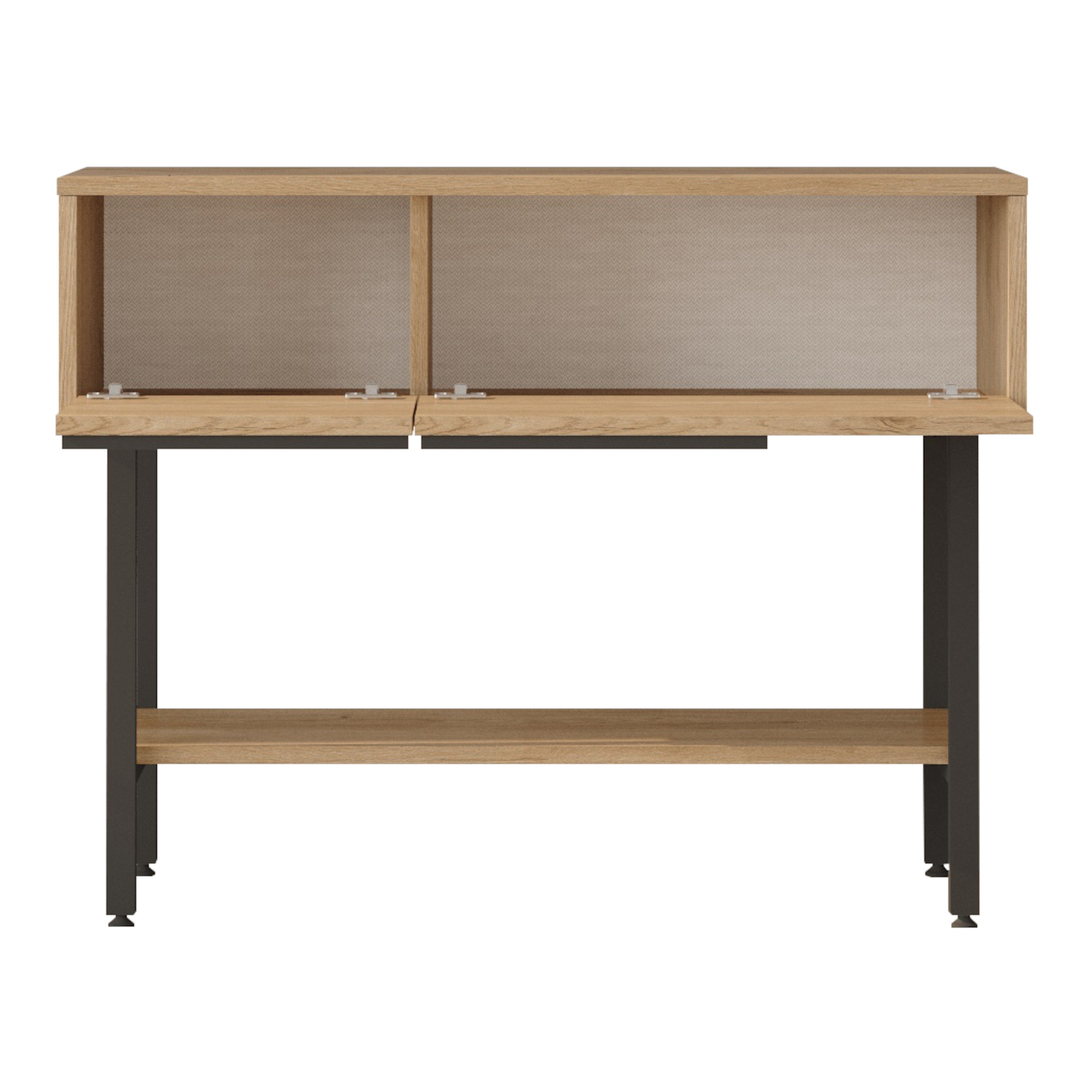 Blatul generos este perfect pentru chei, corespondență, decorațiuni sau accesorii, iar polița inferioară adaugă spațiu suplimentar pentru depozitare. Cele 2 compartimente rabatabile cu mânere integrate te ajută să păstrezi ordinea și să ai la îndemână lucrurile esențiale, de la încărcătoare și consumabile până la obiecte mici de uz casnic.