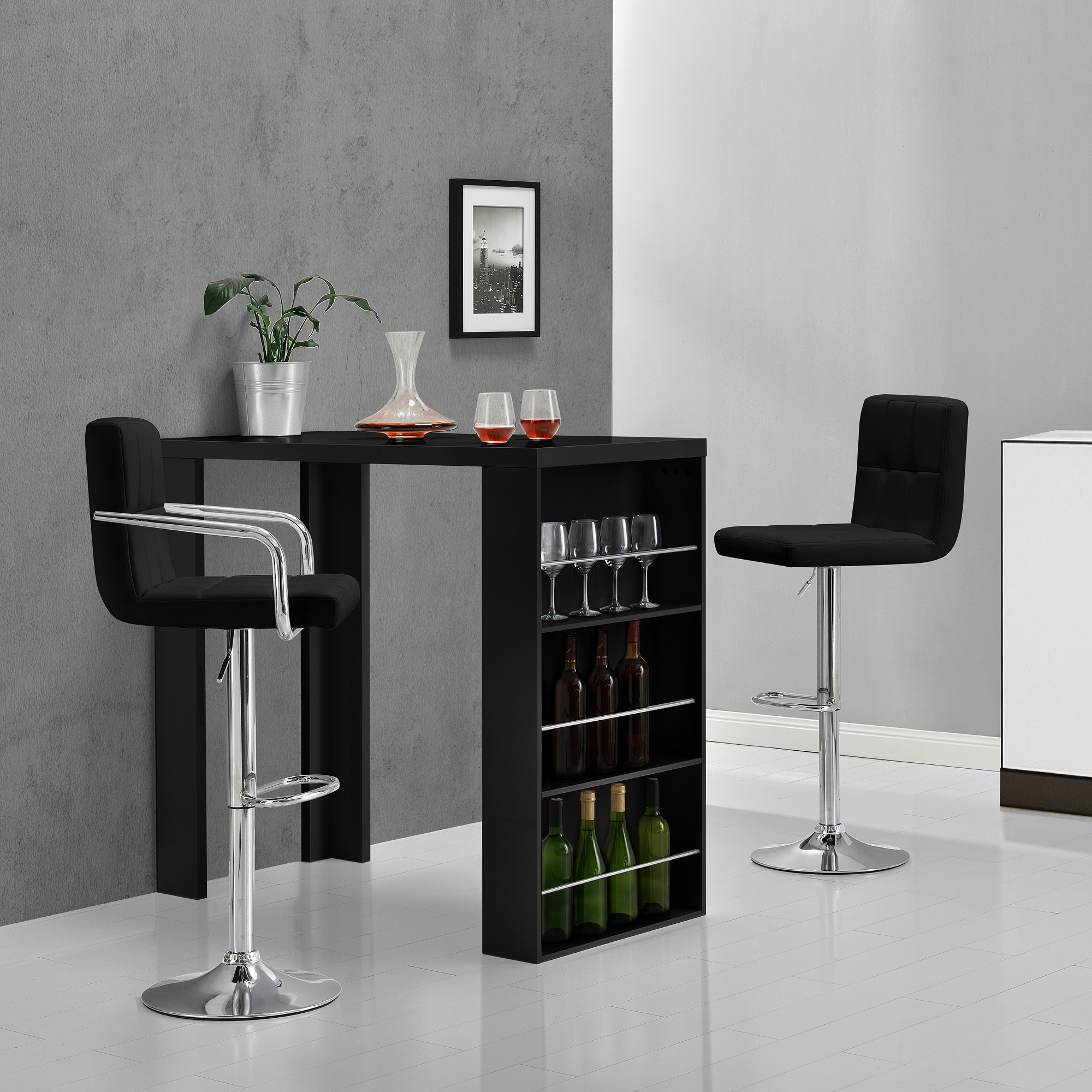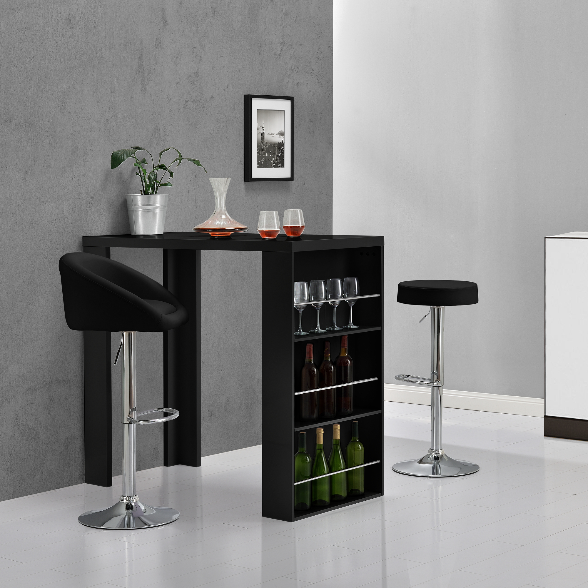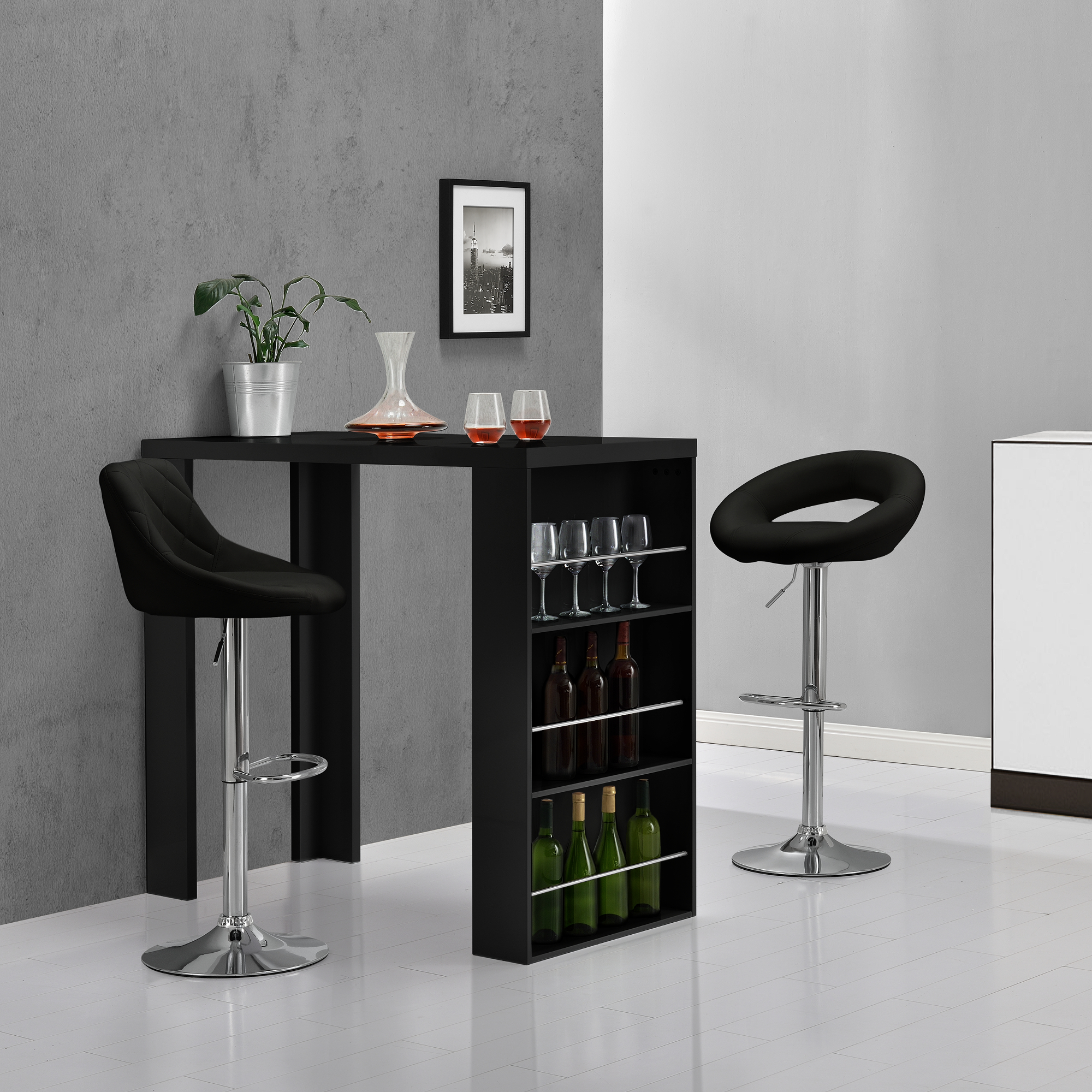 Această masă de bar Bonn este alegerea ideală pentru amenajări moderne, fiind potrivită pentru bucătărie, living sau zona de dining. Designul său elegant, în nuanță neagră, oferă un aspect rafinat, iar bara integrată cu 3 rafturi îți permite să păstrezi la îndemână sticle, pahare și accesorii pentru servire.