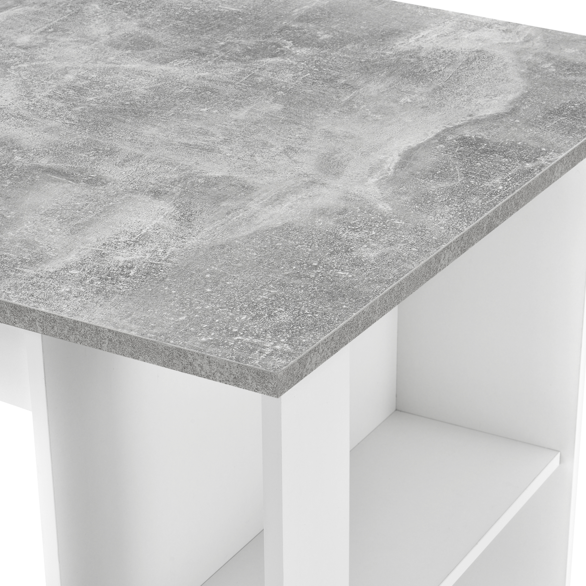 Masă de bar Danderyd cu design modern, perfectă pentru amenajări contemporane în bucătărie, dining sau chiar în zona de lucru de acasă. Combinația dintre finisajul alb și blatul în aspect beton oferă un look elegant, iar raftul lateral integrat adaugă un plus de funcționalitate.