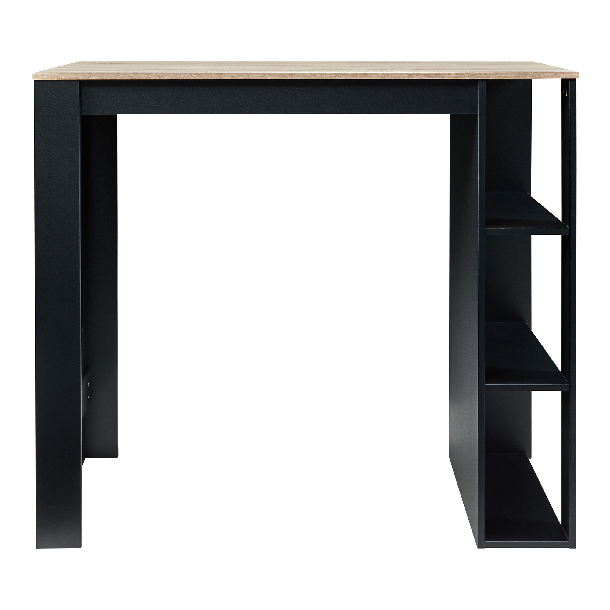 Blatul generos oferă suficient spațiu pentru servirea mesei, cafeaua de dimineață, băuturi sau activități de lucru. În lateral, această masă de bar cu rafturi este prevăzută cu trei compartimente deschise, perfecte pentru sticle, pahare, accesorii de bucătărie sau alte obiecte pe care vrei să le ai la îndemână.