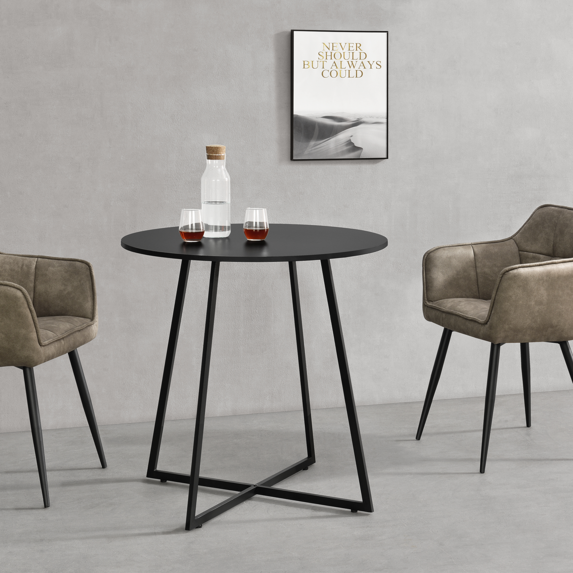 Cu o blat rotund și un cadru metalic solid, această masă de bucătărie neagră asigură stabilitate bună în utilizarea de zi cu zi. Suprafața melaminată se curăță rapid cu o lavetă umedă, iar montajul este simplu și rapid, astfel încât te poți bucura de ea fără efort.