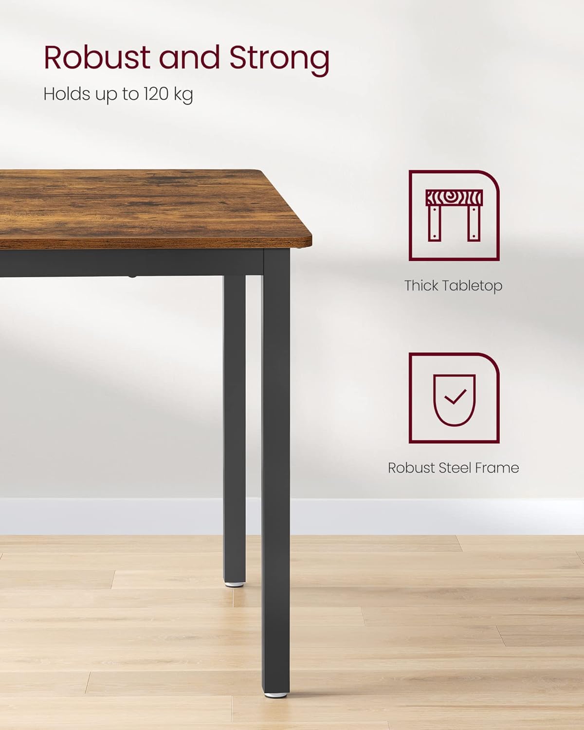 Alege o masa de bucatarie pentru 4 persoane care imbina perfect stilul cu functionalitatea de zi cu zi. Modelul VASAGLE impresioneaza prin designul industrial, cu blat in nuanta maro rustic si cadru metalic negru, potrivindu-se usor in bucatarie, dining, living sau chiar in spatii comerciale precum cafenele si baruri. Este o alegere practica pentru mesele in familie, intalnirile cu prietenii sau pentru amenajarea unui spatiu modern si primitor.