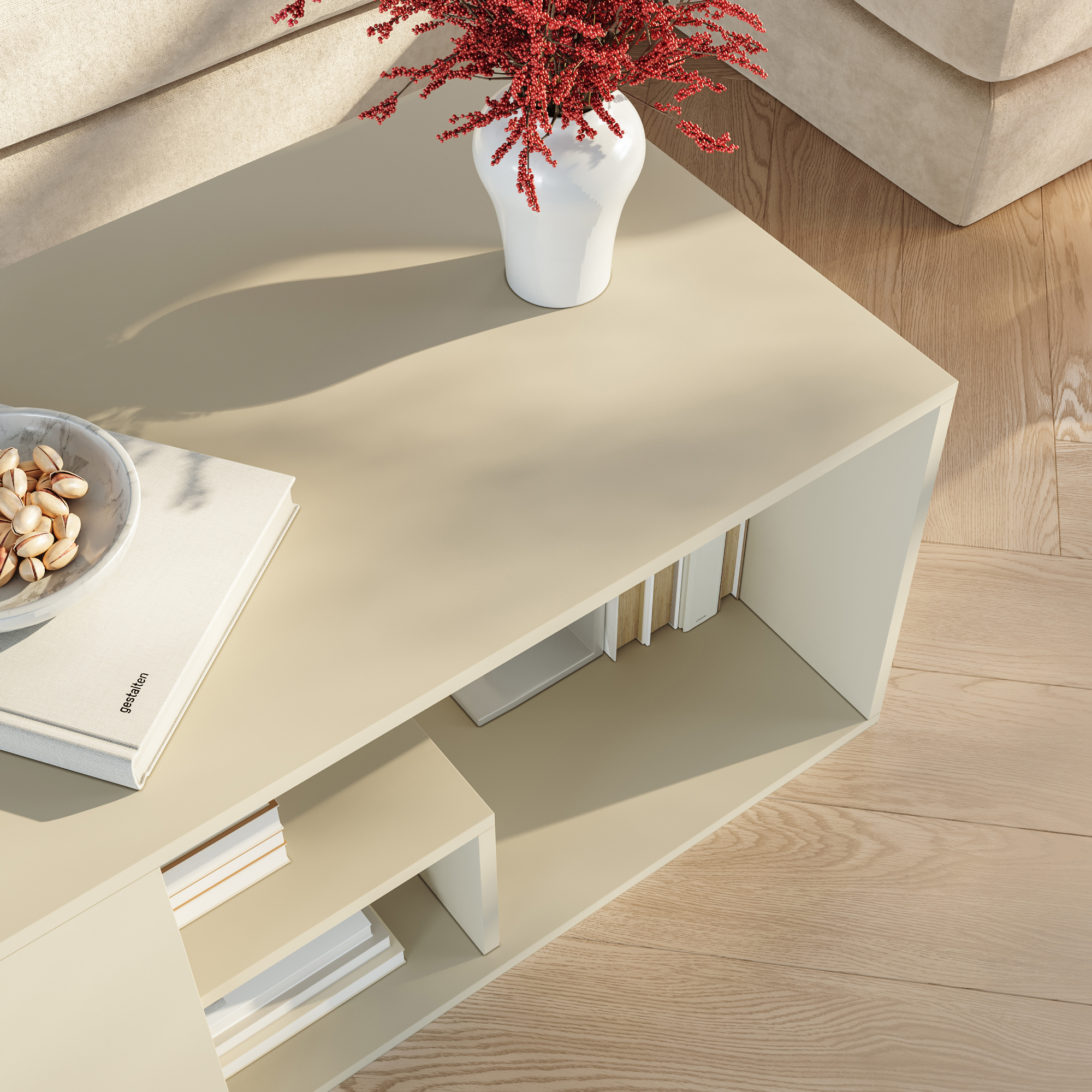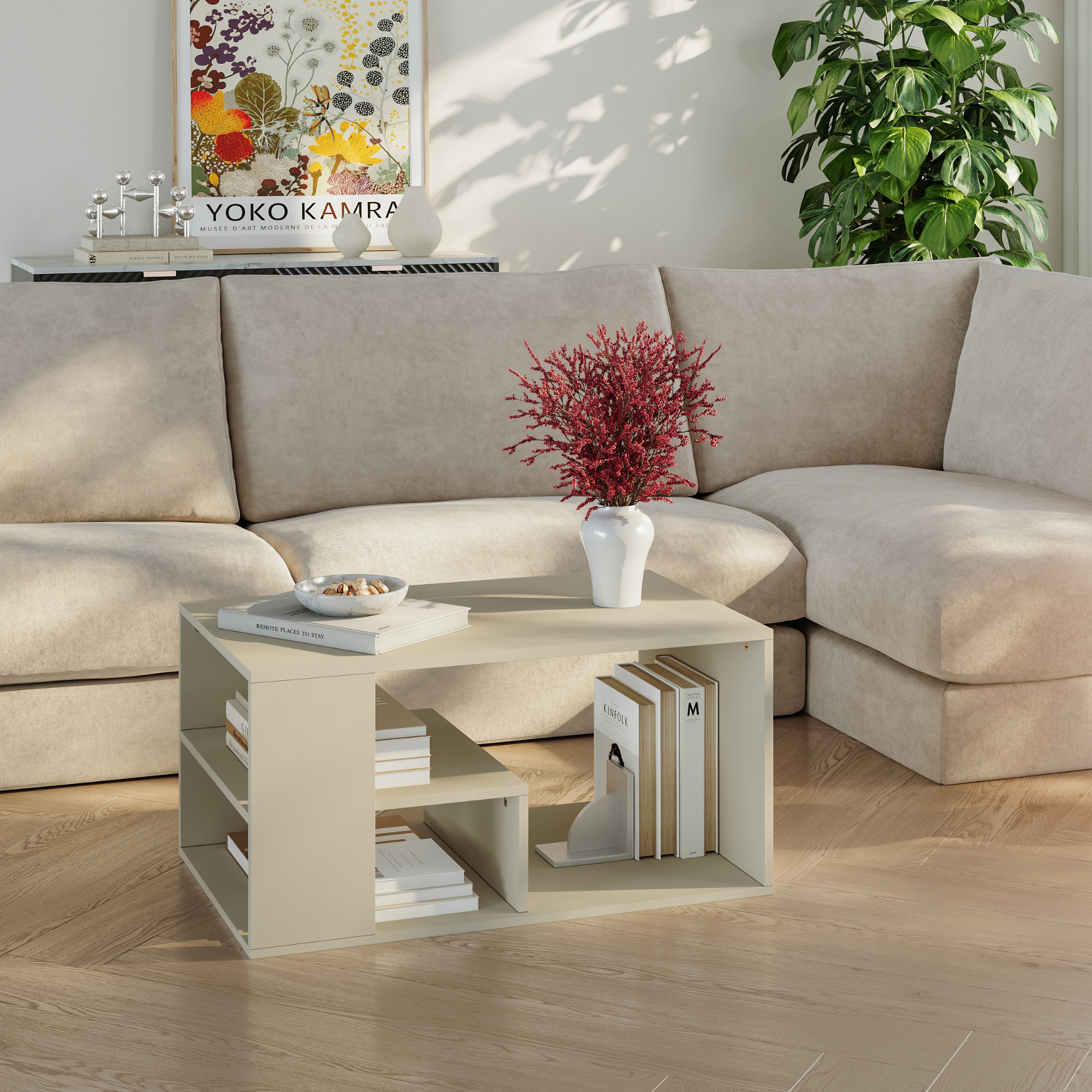 Adaugă un plus de stil și funcționalitate în living cu această masă de cafea cu design modern și aspect atemporal. Finisajul în nuanță nisip se integrează ușor în decoruri contemporane, scandinave sau minimaliste, oferind un ambient cald și elegant.