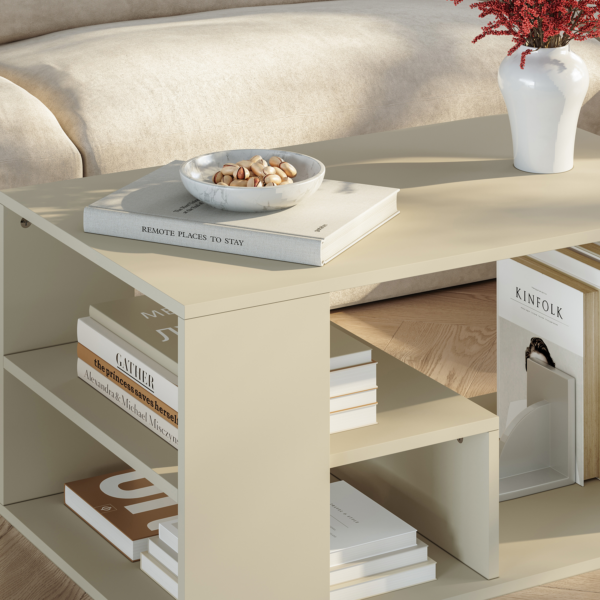 Masă de cafea Antaa 80x50x40 cm, culoare nisip, cu rafturi