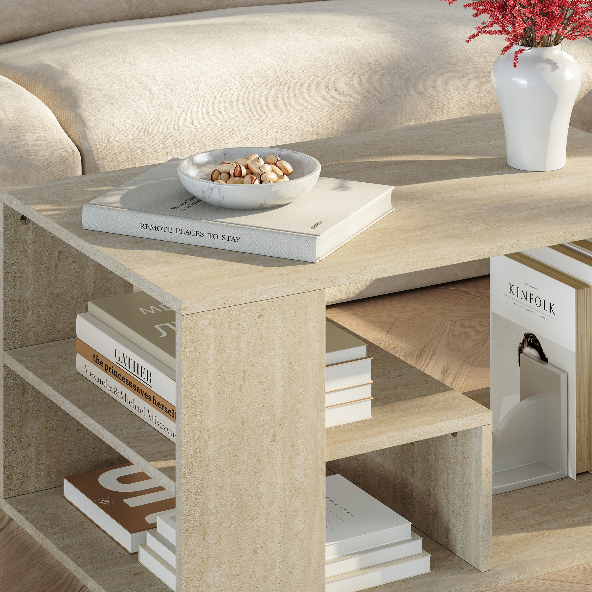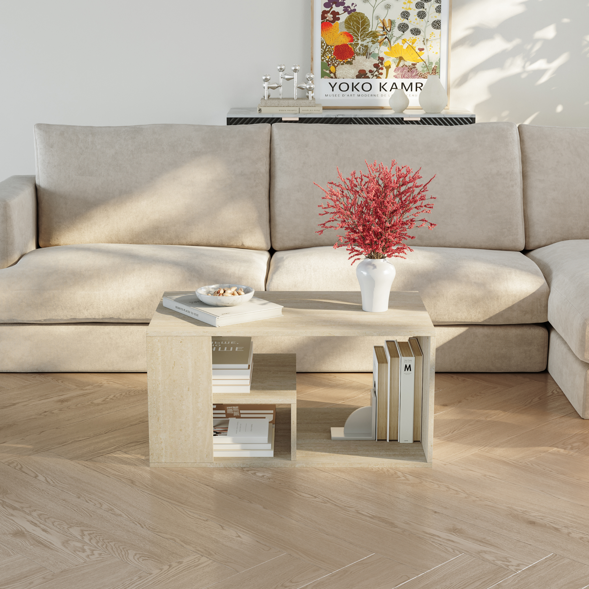 Această masă de cafea elegantă aduce un aer modern și rafinat în living, fiind ușor de integrat în decoruri contemporane, minimaliste sau clasice. Finisajul în nuanță travertin oferă un aspect sofisticat, inspirat de textura pietrei naturale, iar forma dreptunghiulară o face practică pentru utilizarea de zi cu zi.
