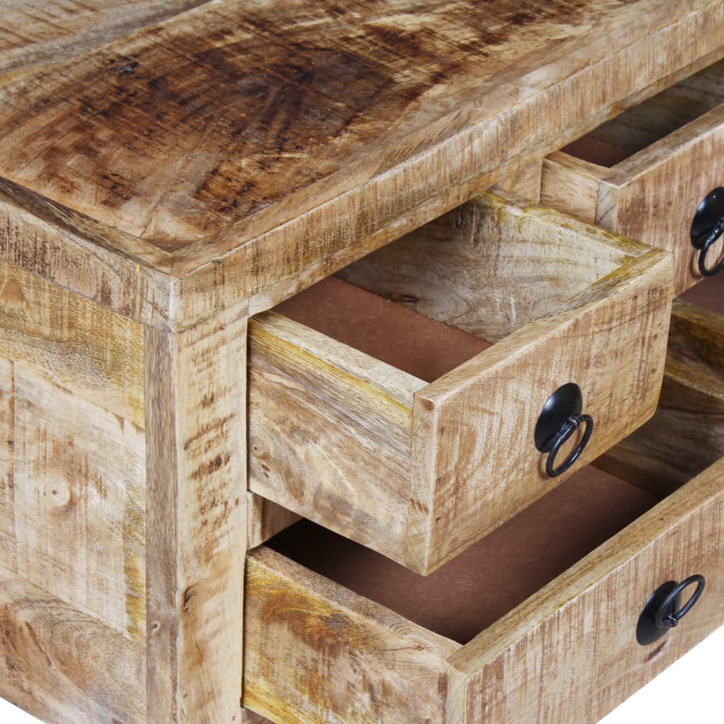Această masă de cafea este fabricată manual din lemn masiv nefinisat de mango, care este stabil, durabil și frumos, iar măiestria cu care a fost creată adaugă un plus de rafinament stilului retro spectaculos. Fiecare pas al procesului de fabricație este îndeplinit cu cea mai mare grijă, fie că este vorba de lustruire sau lăcuire. Măiestria creației și textura frumoasă a lemnului fac ca fiecare piesă de mobilier să fie unică și puțin diferită de următoarea. În plus, cele 5 sertare și compartimentul încăpător din interior oferă spațiu amplu pentru orice obiecte pe care doriți să le țineți la îndemână. Masa dispune de 4 rotile din fier care o fac să fie ușor de mutat și de a completa designul industrial.