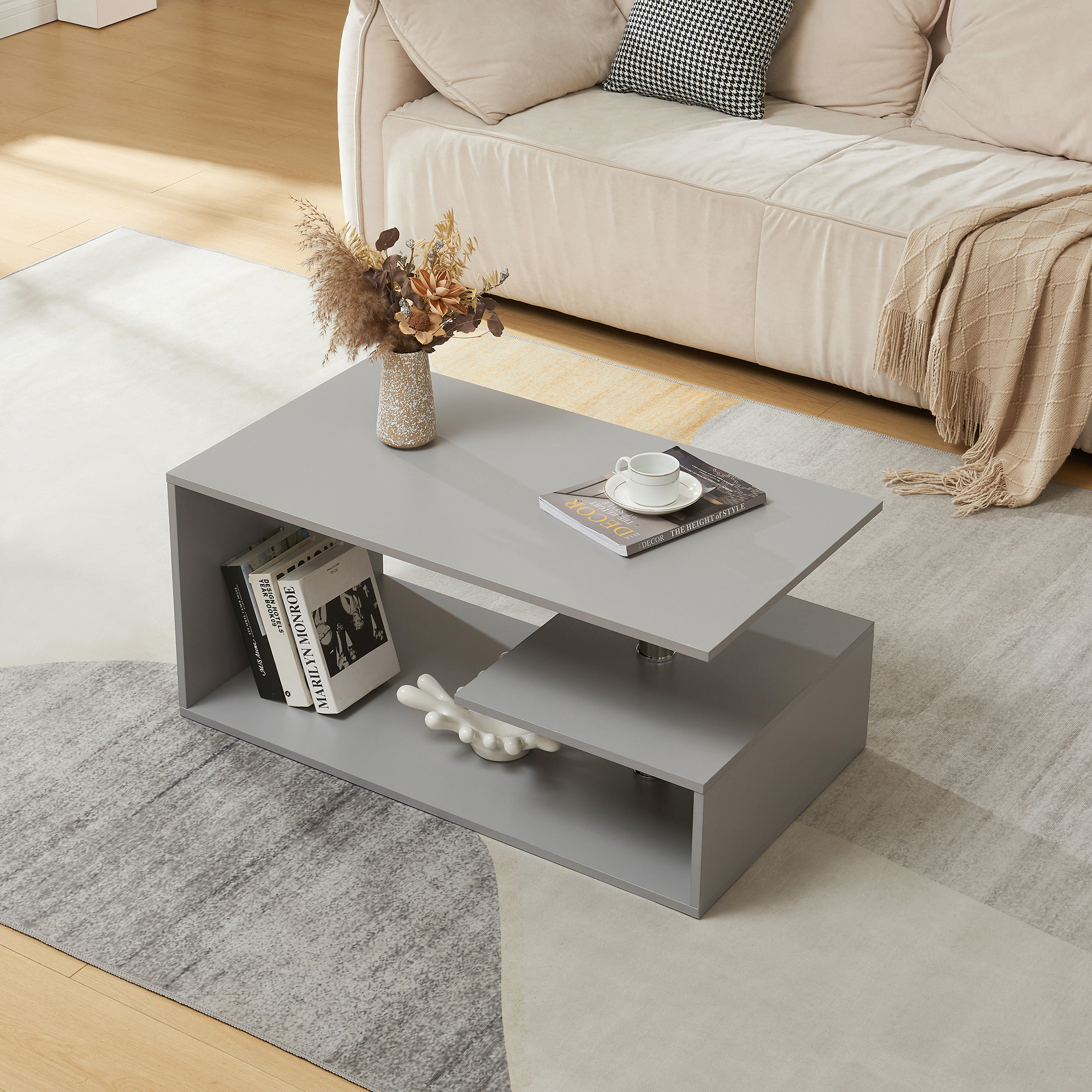 Această măsuță de cafea gri este perfectă pentru zona de relaxare din living, lângă canapea, unde poate servi atât ca suport pentru cafea și decorațiuni, cât și ca spațiu suplimentar de depozitare pentru obiectele de zi cu zi.