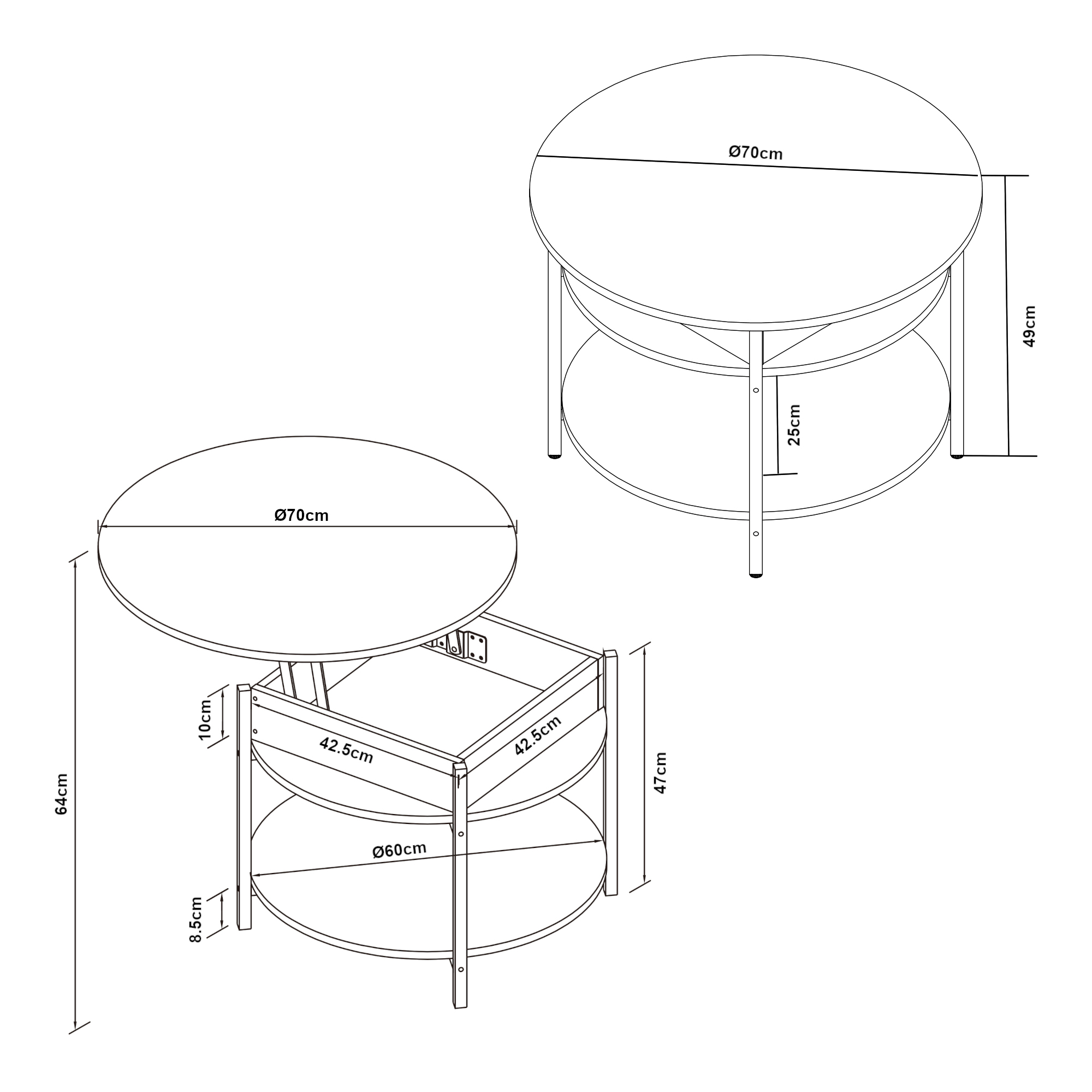 - Dimensiuni masă (diametru x înălțime): 70 x 49 cm