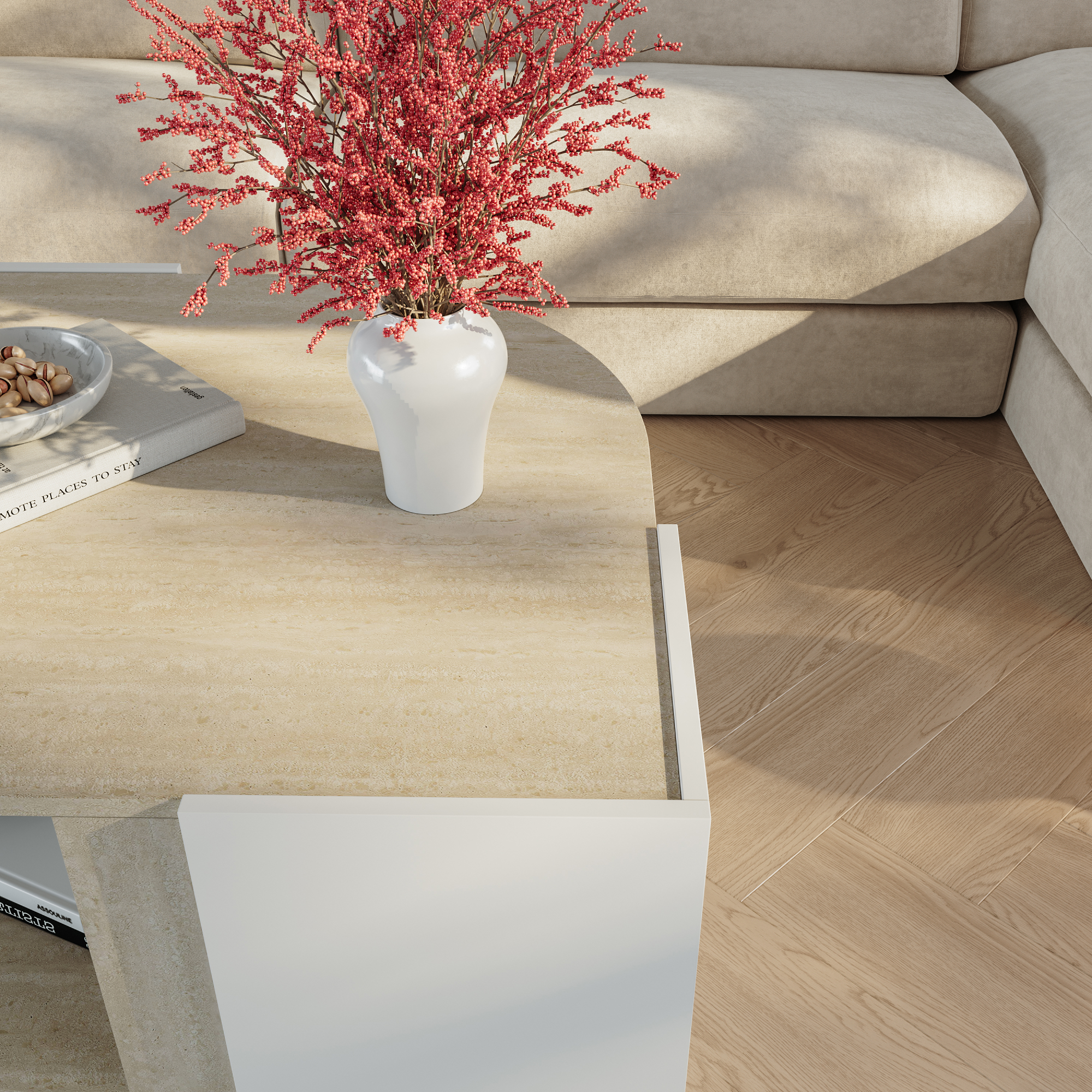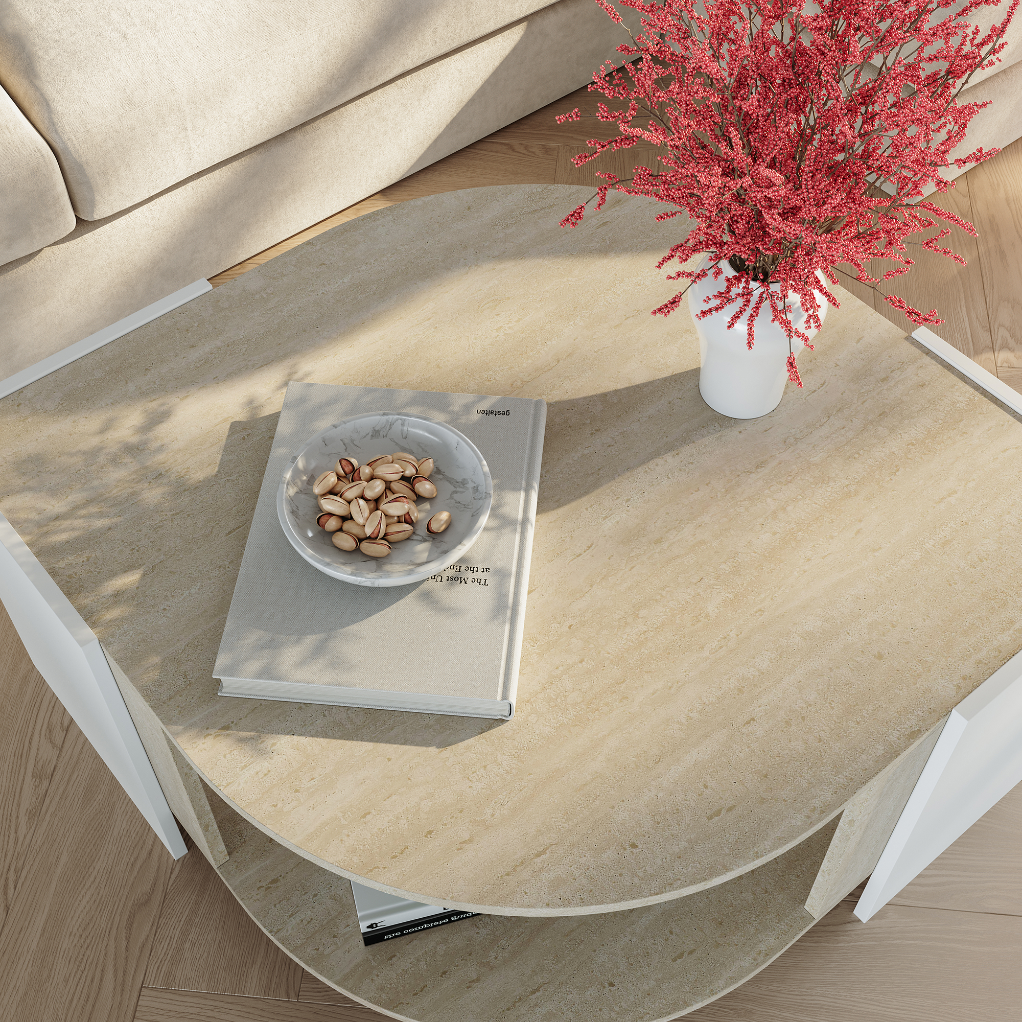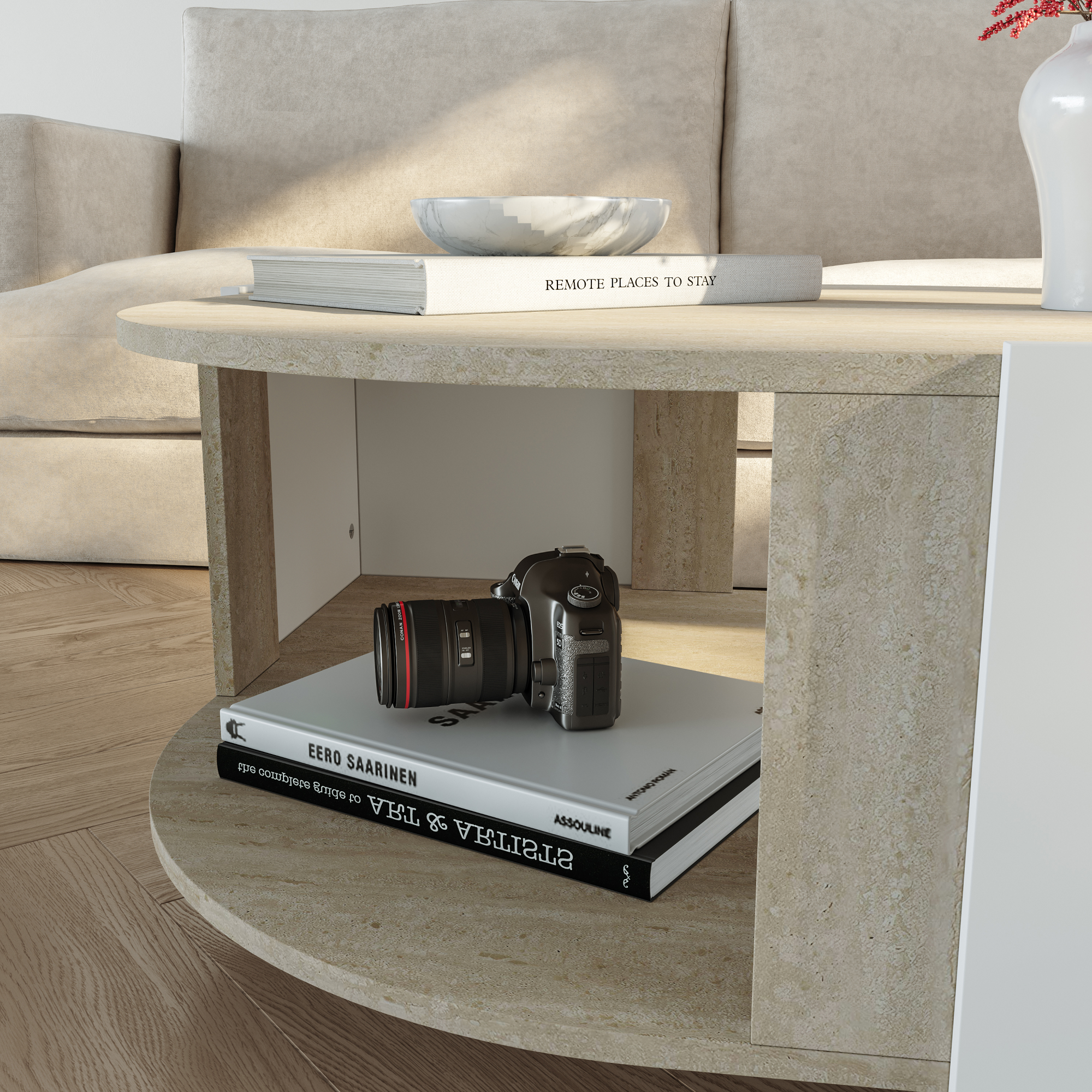 Masă de cafea Klipsari – alegerea ideală pentru un living aerisit, elegant și bine organizat. Cu un design modern, linii curate și combinația rafinată de alb și travertin, această masă de cafea pentru living se integrează ușor în amenajări contemporane, minimaliste sau scandinave.
