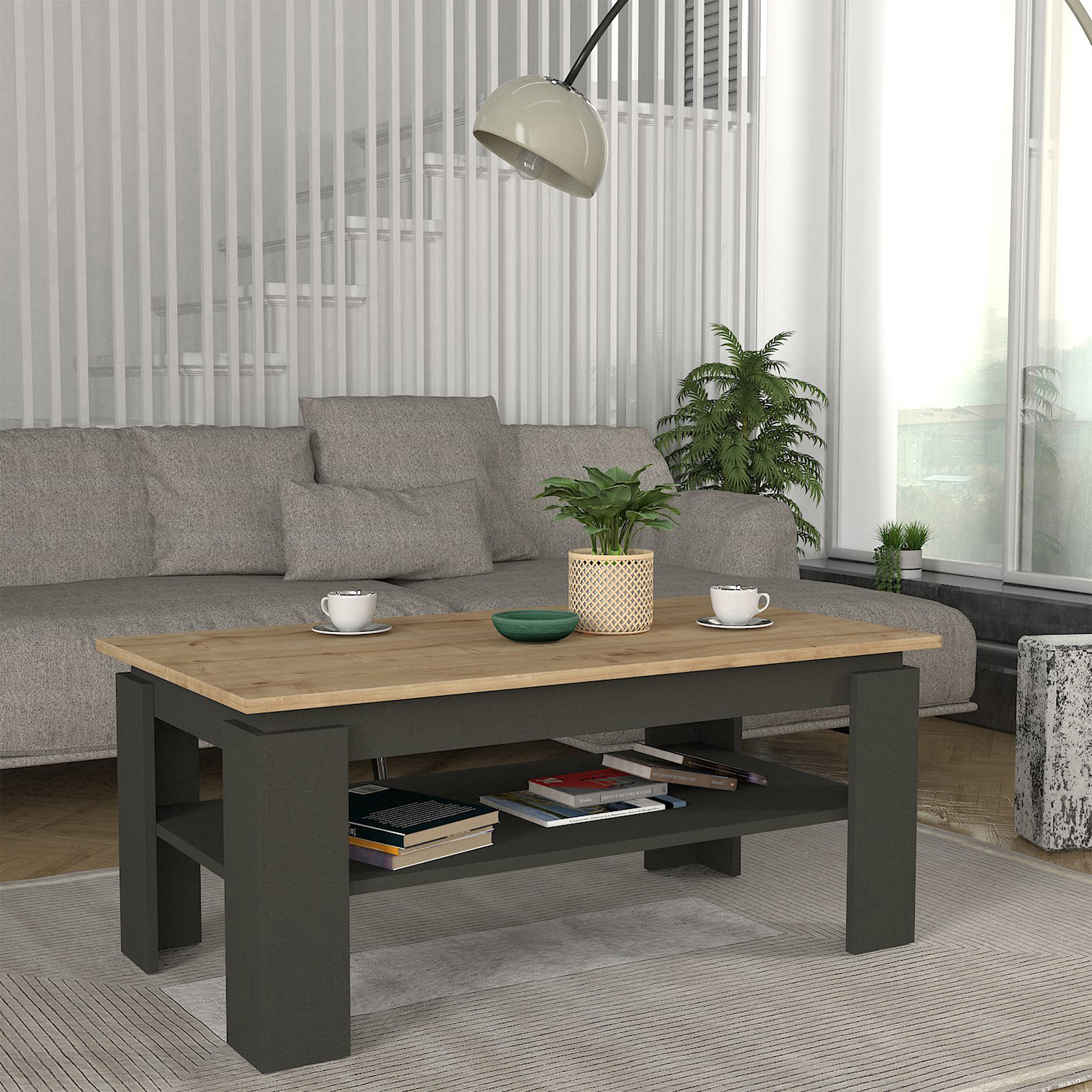 Această masă de cafea modernă aduce un plus de stil și funcționalitate în livingul tău. Designul elegant, în combinația de culori antracit și stejar safir, se integrează ușor în amenajări contemporane, minimaliste sau clasice.
