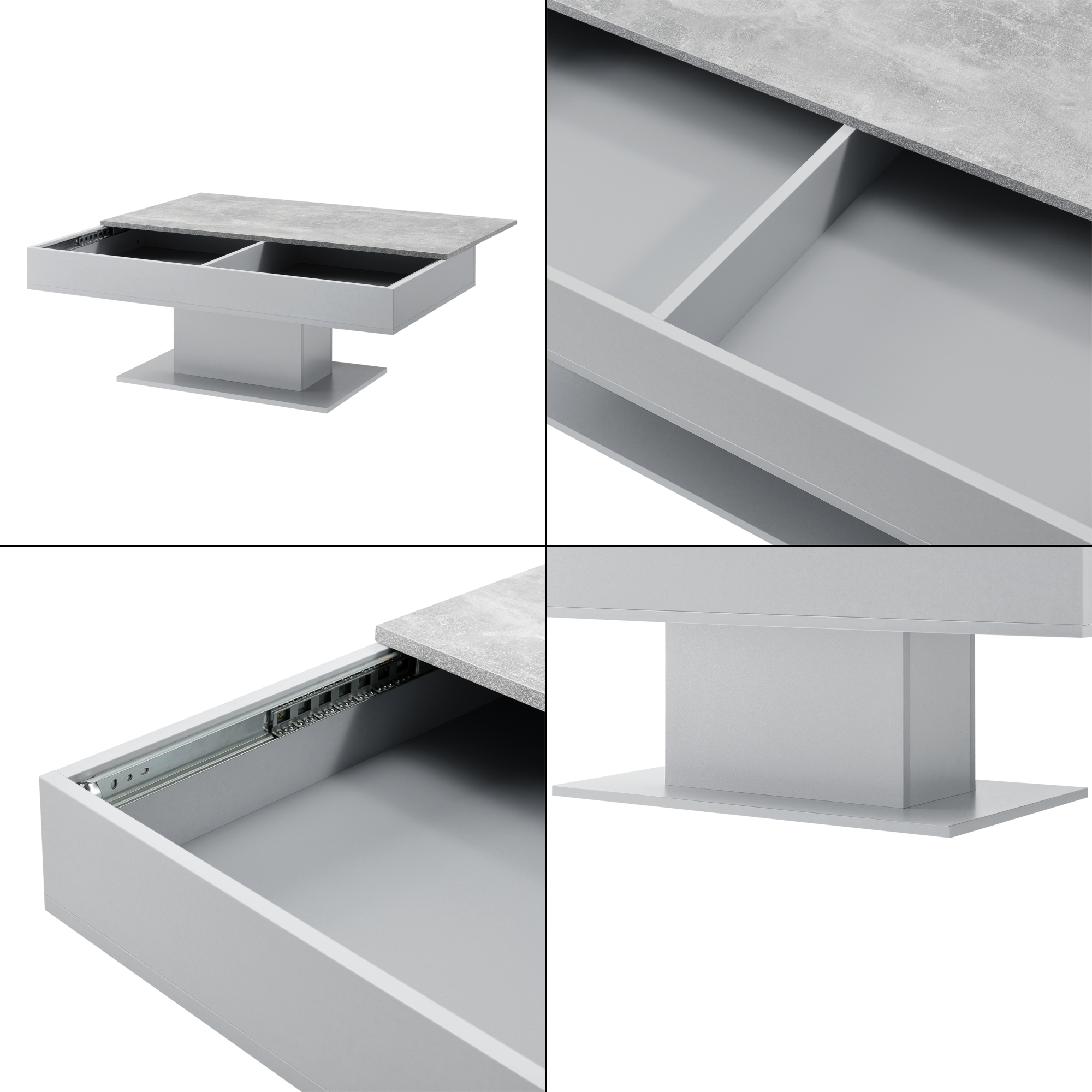 Această masă de cafea pentru living este potrivită pentru spațiile în care vrei să combini estetica modernă cu utilitatea. Poate fi folosită ca suport pentru băuturi, gustări, cărți sau decorațiuni, iar compartimentele ascunse contribuie la un decor ordonat și aerisit.
