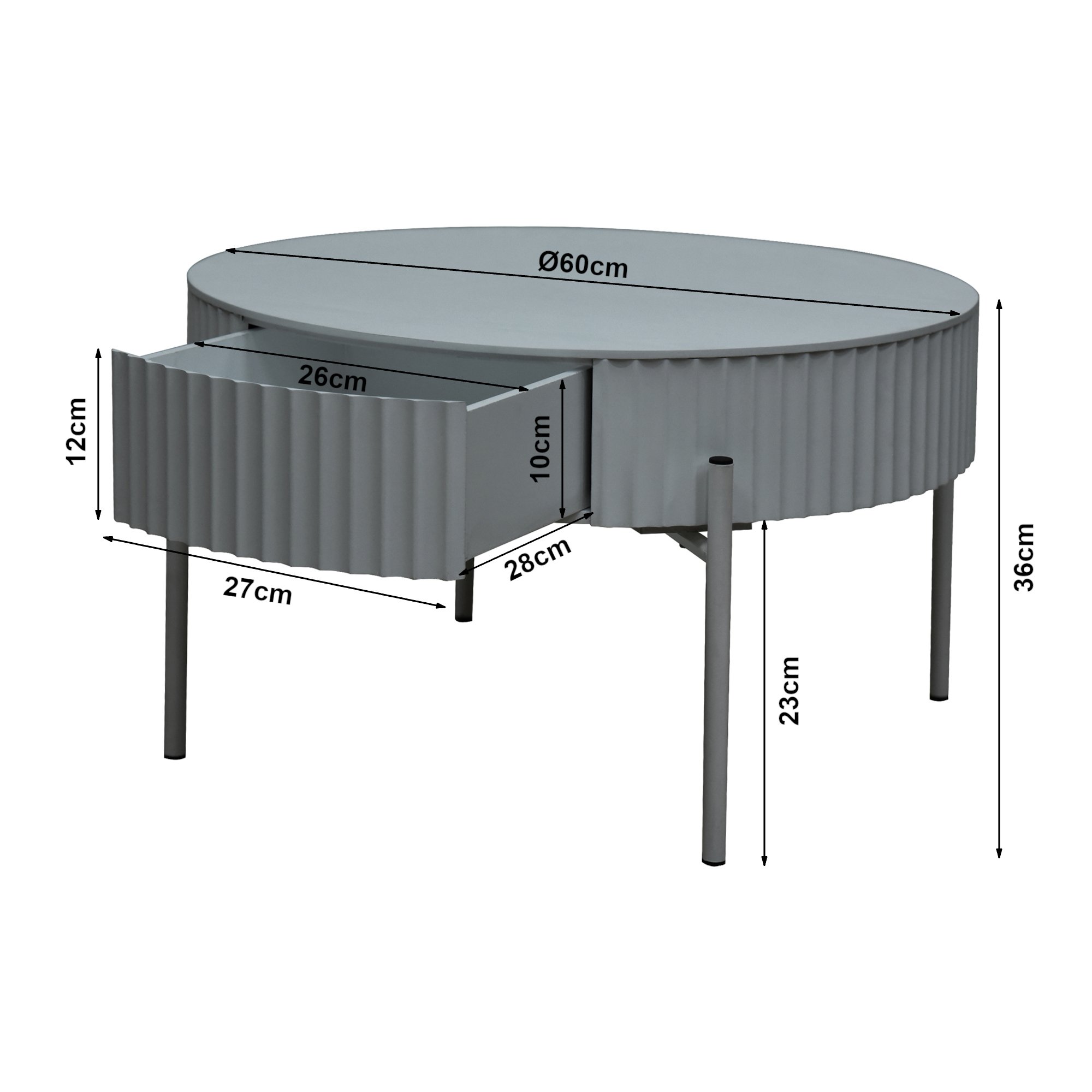 Adu un plus de stil în living cu această masă de cafea rotundă, elegantă și practică, potrivită pentru amenajări moderne, minimaliste sau contemporane. Finisajul gri și designul cu linii verticale oferă un aspect rafinat, iar forma rotundă se integrează armonios în diverse tipuri de spații.