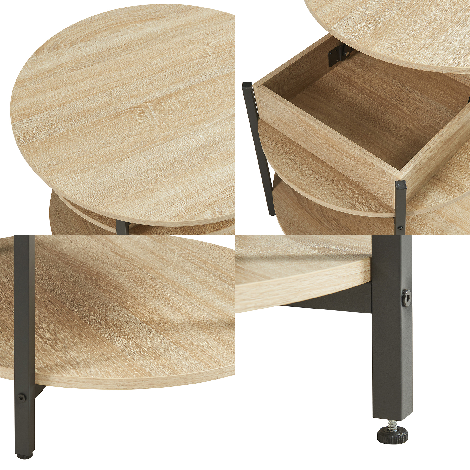 Masă de cafea rotundă cu blat rabatabil – o alegere practică și elegantă pentru orice living modern. Cu un design contemporan, finisaj în aspect stejar și cadru metalic negru, această masă de cafea se integrează ușor în decoruri scandinave, minimaliste sau industriale.
