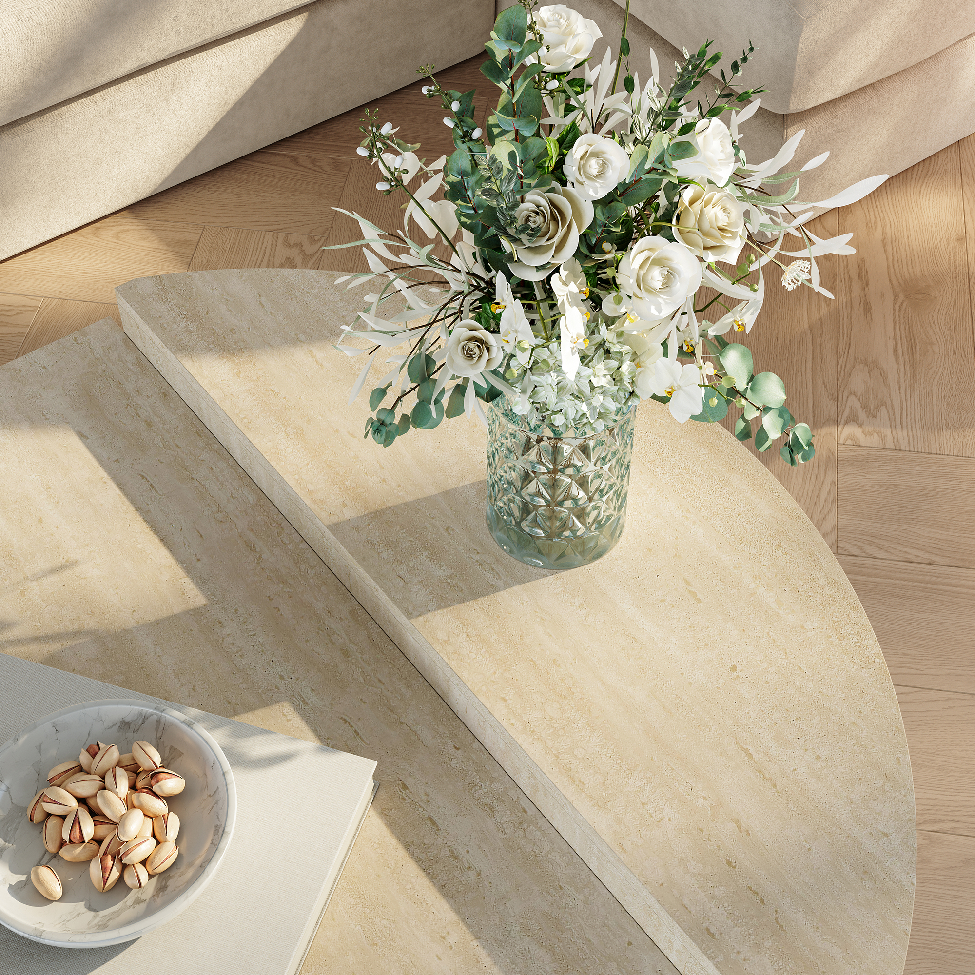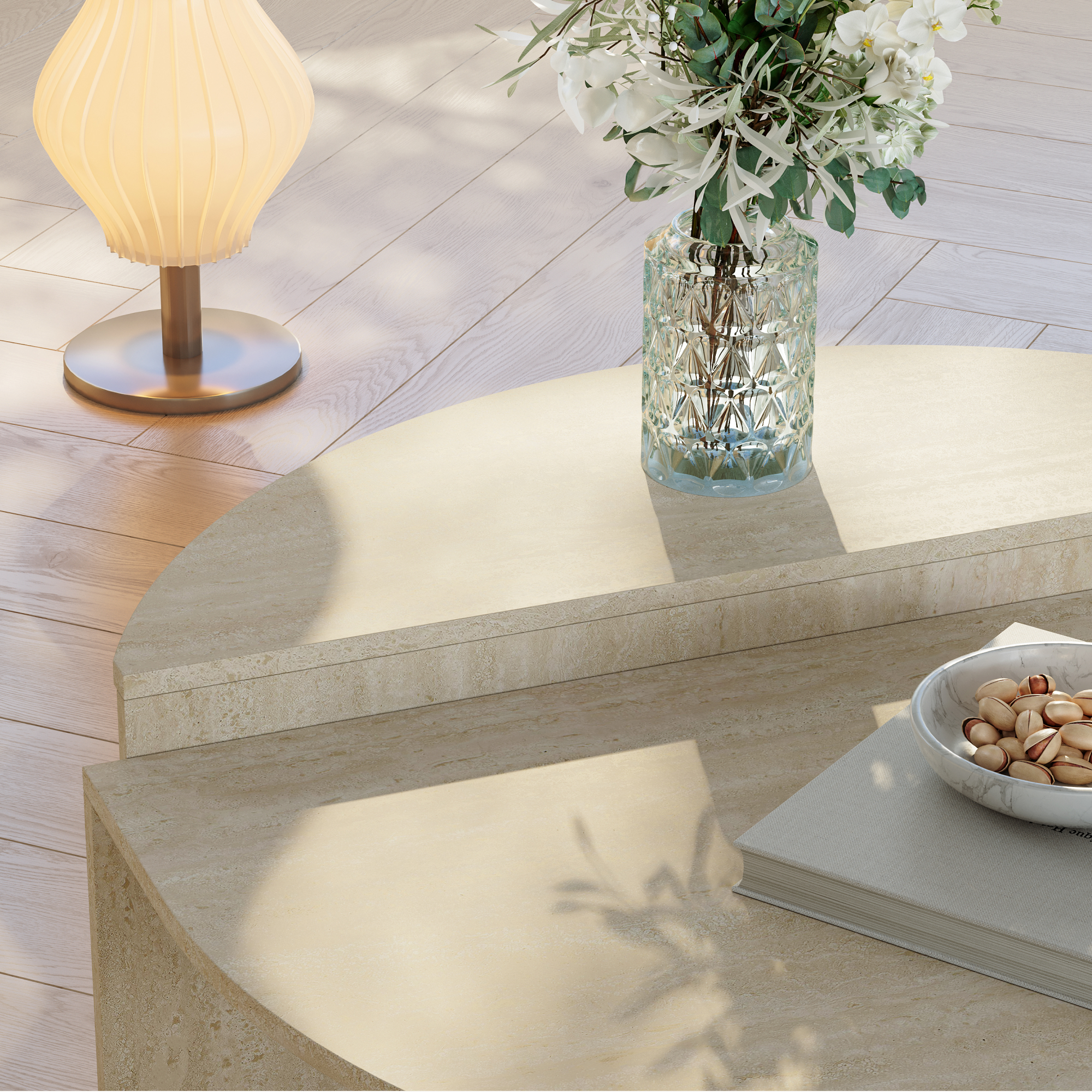 Masă de cafea modernă pentru living, cu un design elegant și atemporal, ușor de integrat în amenajări contemporane, minimaliste sau naturale. Finisajul în nuanță travertin oferă un aspect rafinat, iar cele două blaturi semirotunde creează un efect vizual aparte și un spațiu practic pentru obiectele de zi cu zi.