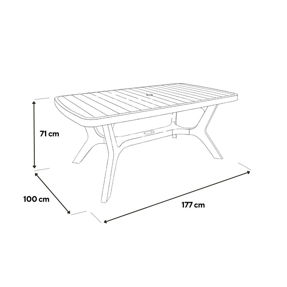 Potrivită ca masă de exterior pentru grădină, terasă sau balcon spațios. Se combină ușor cu diverse modele de scaune și accesorii, fiind o alegere practică pentru întâlniri de familie, grătare sau cafeaua de dimineață.