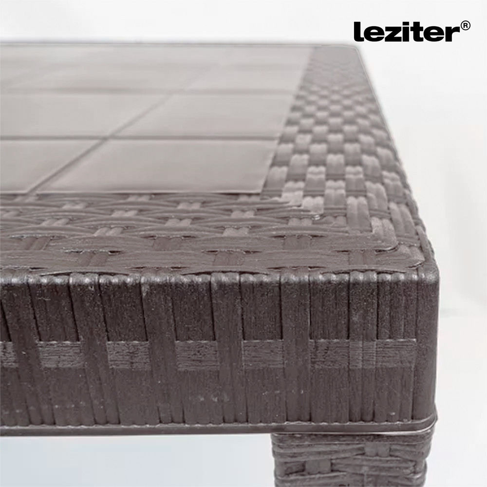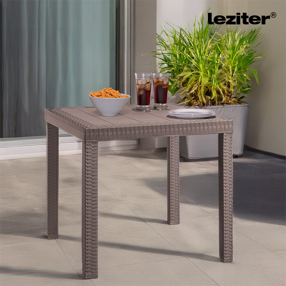 Masă de grădină din plastic Leziter Diana este alegerea potrivită pentru amenajarea unui balcon, a unei terase sau a unei grădini moderne. Cu un design practic, finisaj cu efect de rattan și nuanță elegantă cappuccino, această masă de exterior oferă un echilibru foarte bun între aspect plăcut, durabilitate și întreținere minimă.