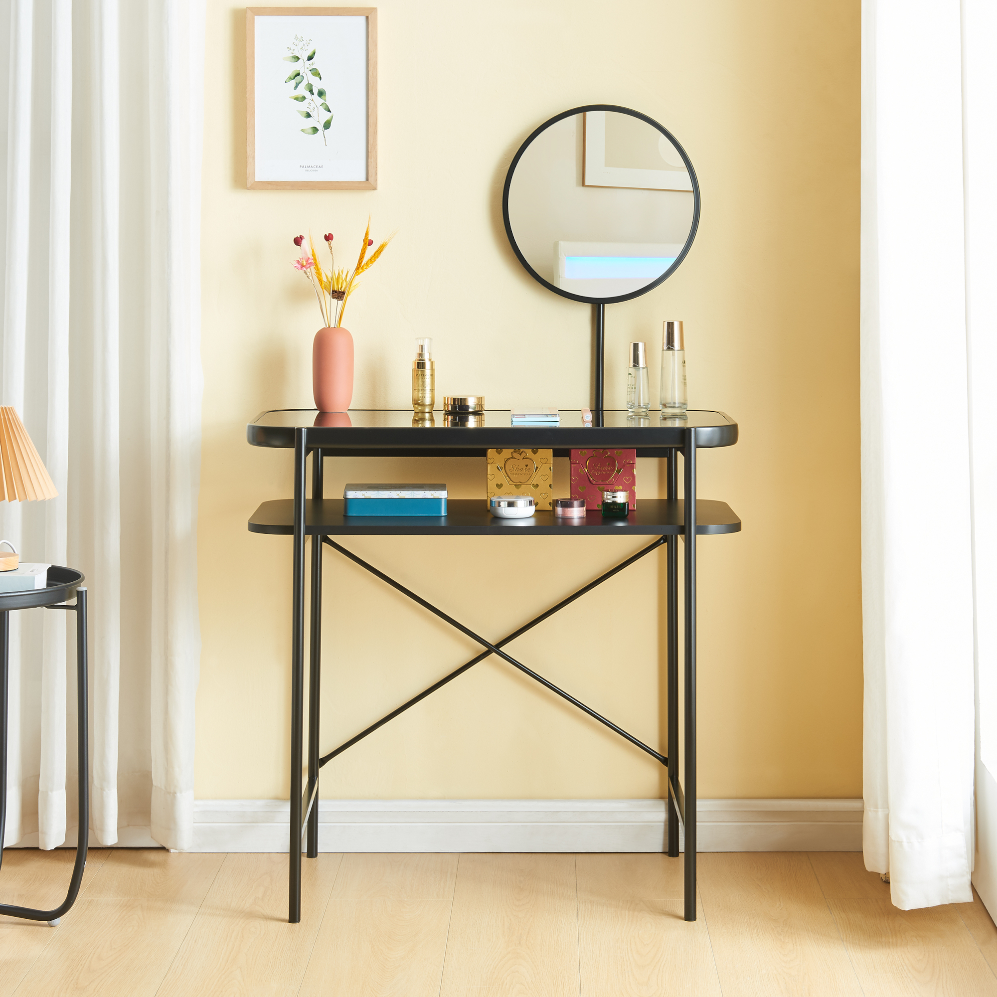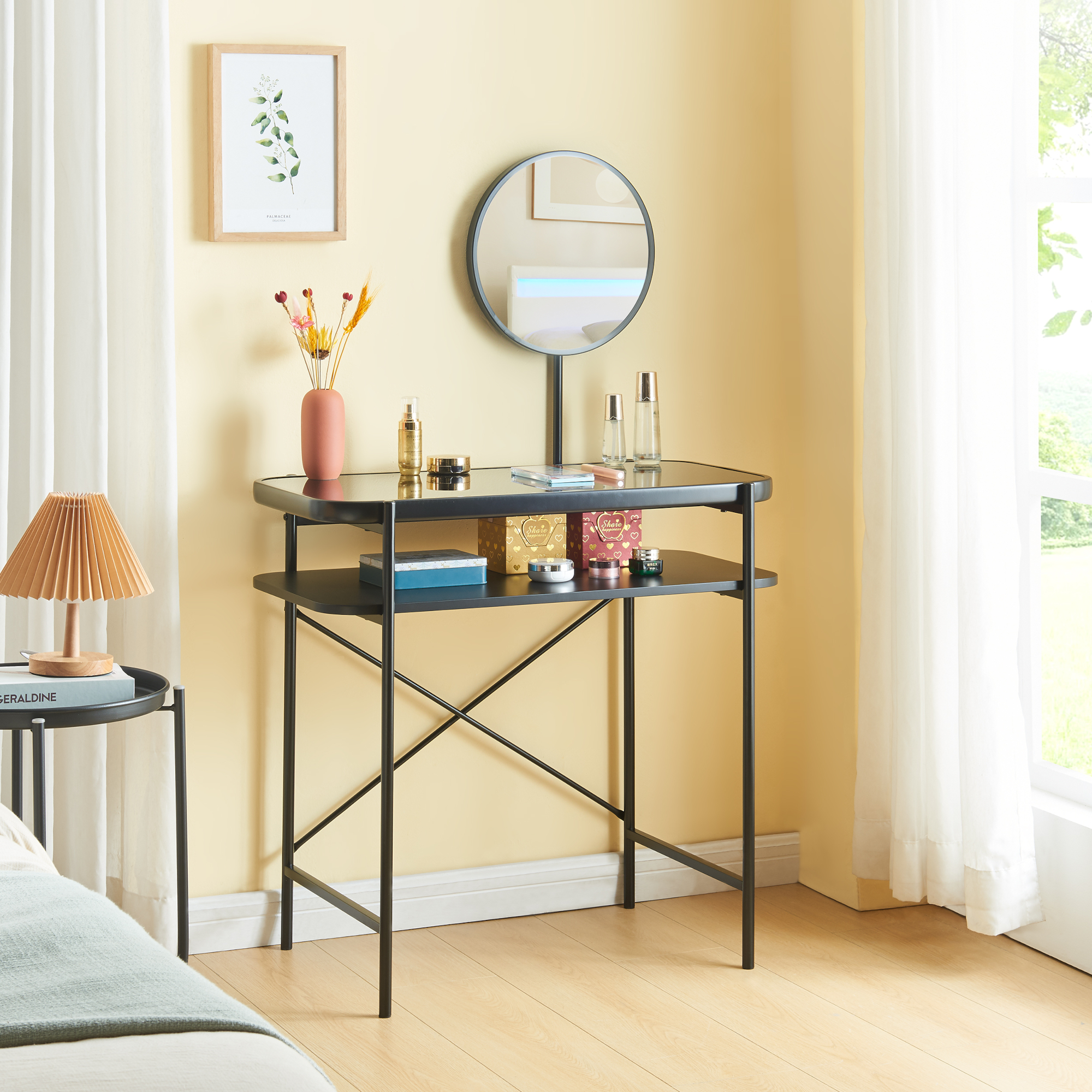 Masă de machiaj Hjelmeland cu oglindă, poliță și blat din sticlă, neagră