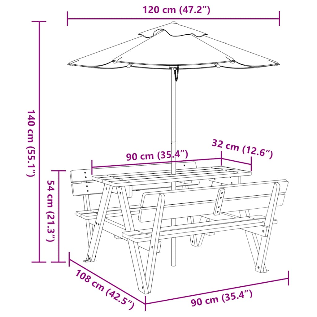 Masă de picnic pentru 4 copii, cu umbrelă, lemn masiv brad GartenMobel Dekor