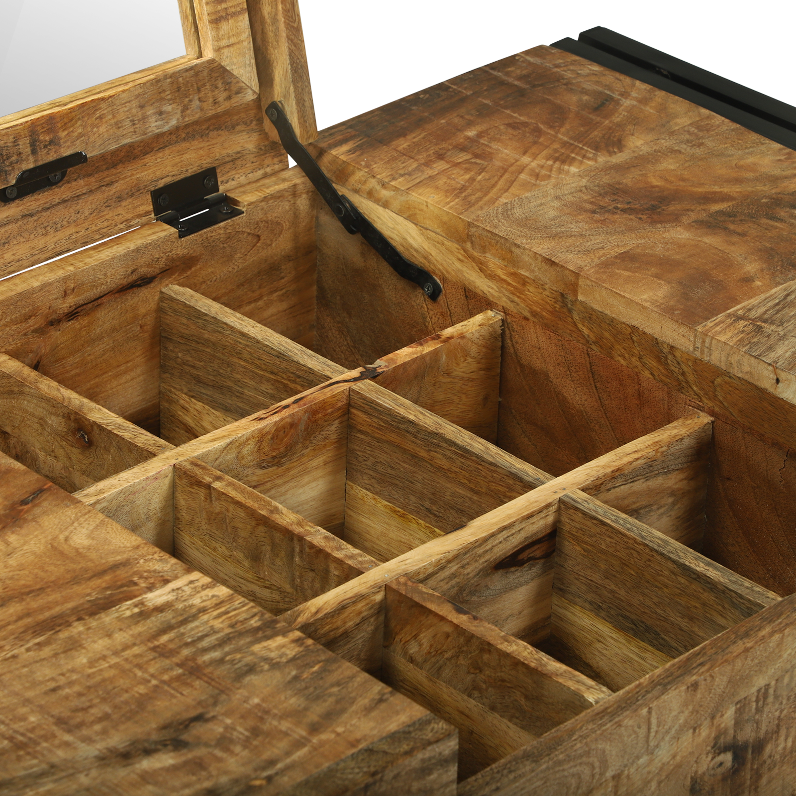 Masa asta de toaletă aduce un stil rustic și utilitate în dormitorul tău. Facută din lemn solid de mango, finisajul ei natural scoate în evidență textura adorabilă, fiind ideală pentru a-ți pune la punct machiajul sau ca loc de lucru. Cadrele din oțel negru îi dau un avantaj modern, potrivindu-se de minune în diferite stiluri de decor.