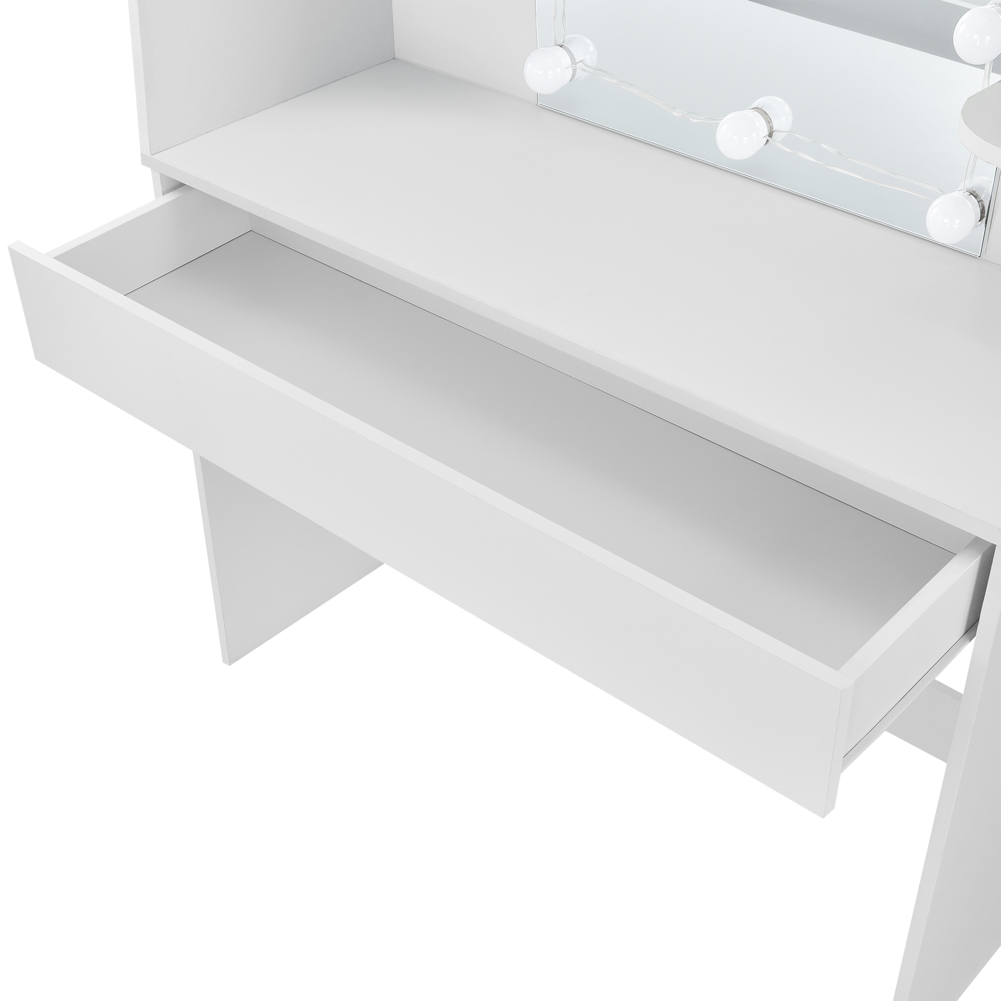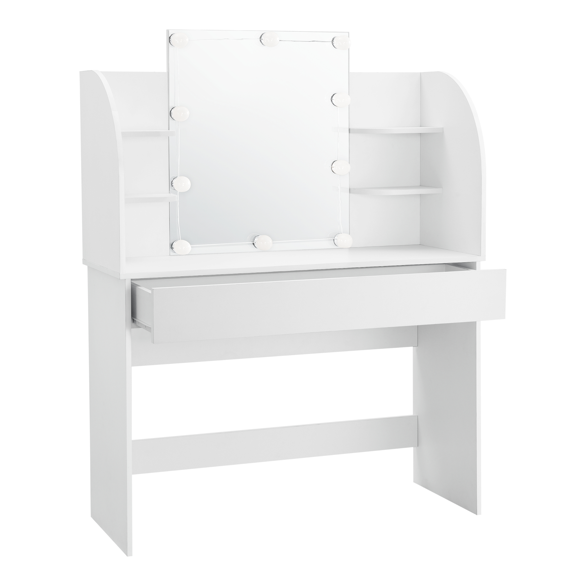 Datorită oglinzii generoase și instalației cu 10 becuri LED, vei beneficia de o iluminare plăcută și practică. Cele 3 nuanțe de lumină – alb cald, alb neutru și alb rece – te ajută să adaptezi atmosfera și vizibilitatea în funcție de momentul zilei sau de tipul machiajului. Rafturile laterale și sertarul spațios oferă loc suficient pentru depozitare, astfel încât totul să fie mereu la îndemână.