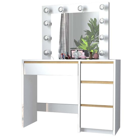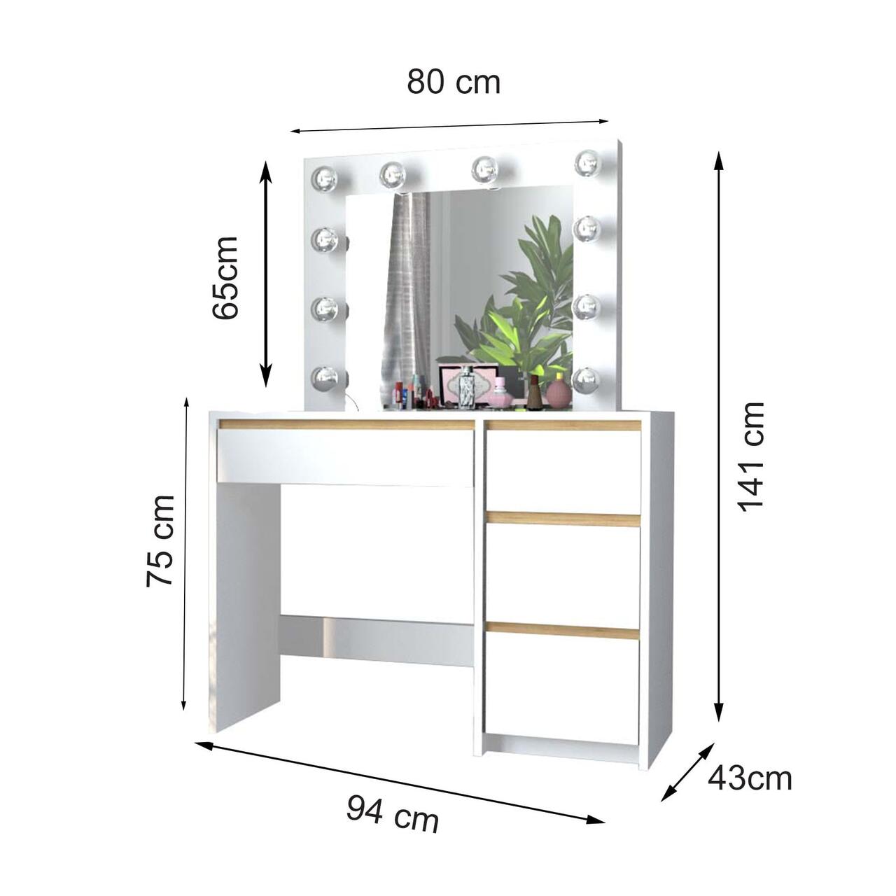 - Este o piesa de mobilier eleganta si practica, proiectata pentru a satisface nevoile si preferintele persoanelor care cauta un spatiu dedicat pentru a-si ingriji frumusetea si a-si stoca cosmeticele si bijuteriile. Aceasta masa este prevazuta cu o oglinda mare si 10 lumini LED incorporate, ceea ce o face ideala pentru aplicarea machiajului sau coafurii.