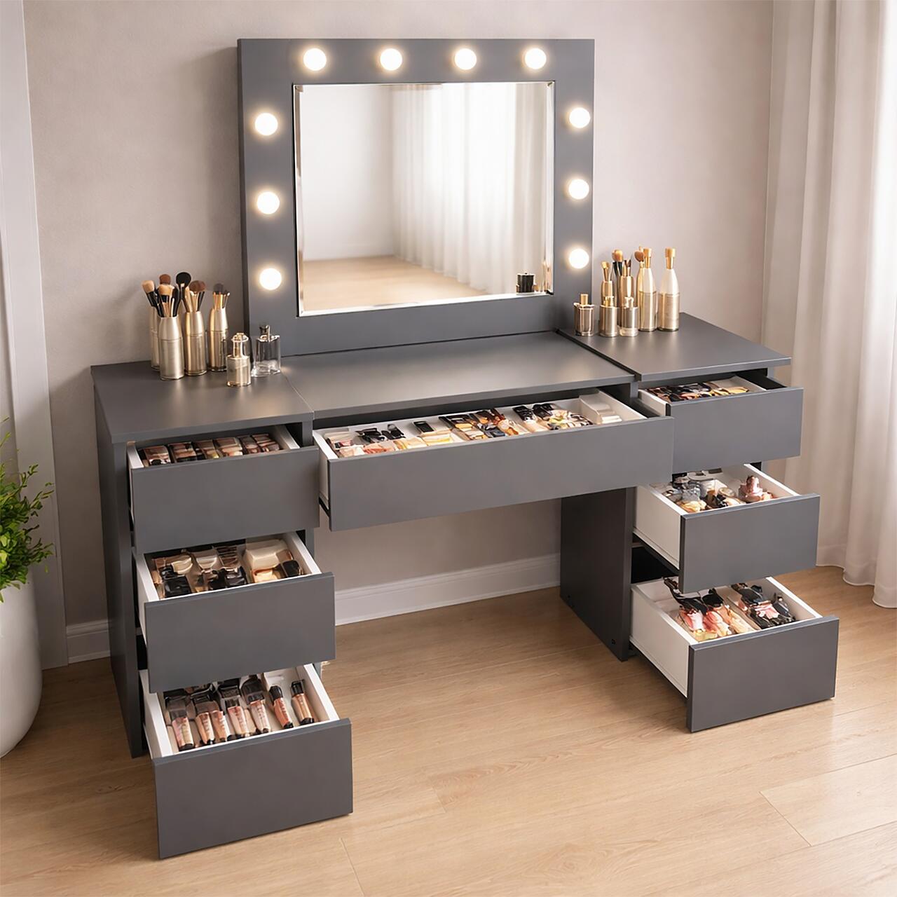 - Este o piesa de mobilier eleganta si practica, proiectata pentru a satisface nevoile si preferintele persoanelor care cauta un spatiu dedicat pentru a-si ingriji frumusetea si a-si stoca cosmeticele si bijuteriile. Aceasta masa este prevazuta cu o oglinda mare si 10 lumini LED incorporate, ceea ce o face ideala pentru aplicarea machiajului sau coafurii.
