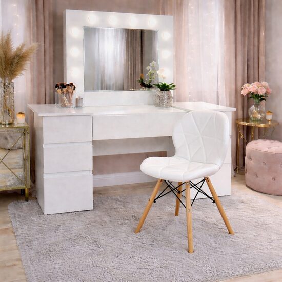 Pachetul include, de asemenea, un scaun foarte confortabil, in stil modern, care se va asorta perfect cu masa de machiaj!