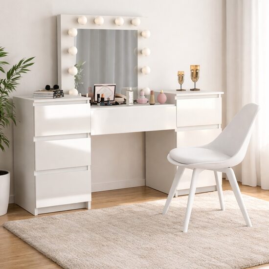 - Este o piesa de mobilier eleganta si practica, proiectata pentru a satisface nevoile si preferintele persoanelor care cauta un spatiu dedicat pentru a-si ingriji frumusetea si a-si stoca cosmeticele si bijuteriile. Aceasta masa este prevazuta cu o oglinda mare si 12 lumini LED incorporate, ceea ce o face ideala pentru aplicarea machiajului sau coafurii.