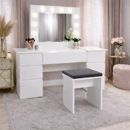 Masa de toaleta/machiaj, Antonia + taburet, alb, cu oglinda si LED-uri, 155x42x135 cm