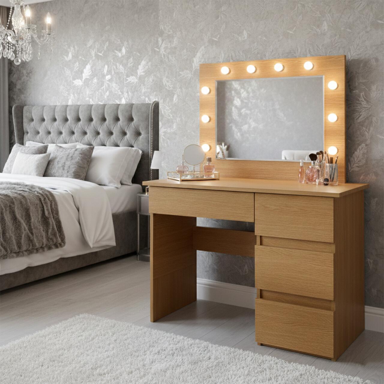 Transforma-ti rutina de machiaj intr-o experienta confortabila si eleganta cu masa de toaleta IRINA Stejar. Combinatia dintre finisajul natural, iluminarea LED reglabila si spatiile generoase de depozitare o face alegerea ideala pentru oricine isi doreste confort si functionalitate in propria camera.
