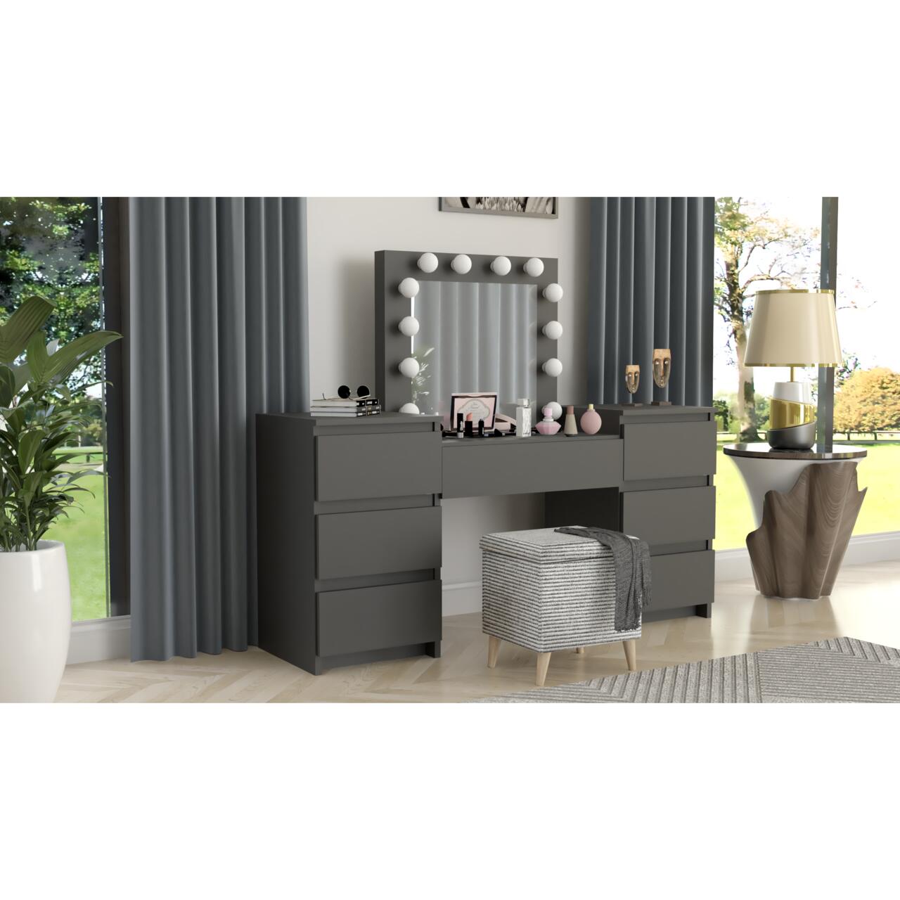 - Este o piesa de mobilier eleganta si practica, proiectata pentru a satisface nevoile si preferintele persoanelor care cauta un spatiu dedicat pentru a-si ingriji frumusetea si a-si stoca cosmeticele si bijuteriile. Aceasta masa este prevazuta cu o oglinda mare si 12 lumini LED incorporate, ceea ce o face ideala pentru aplicarea machiajului sau coafurii.