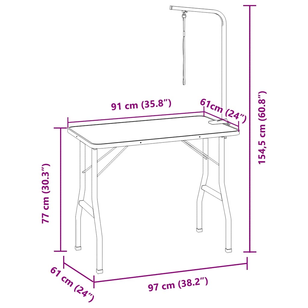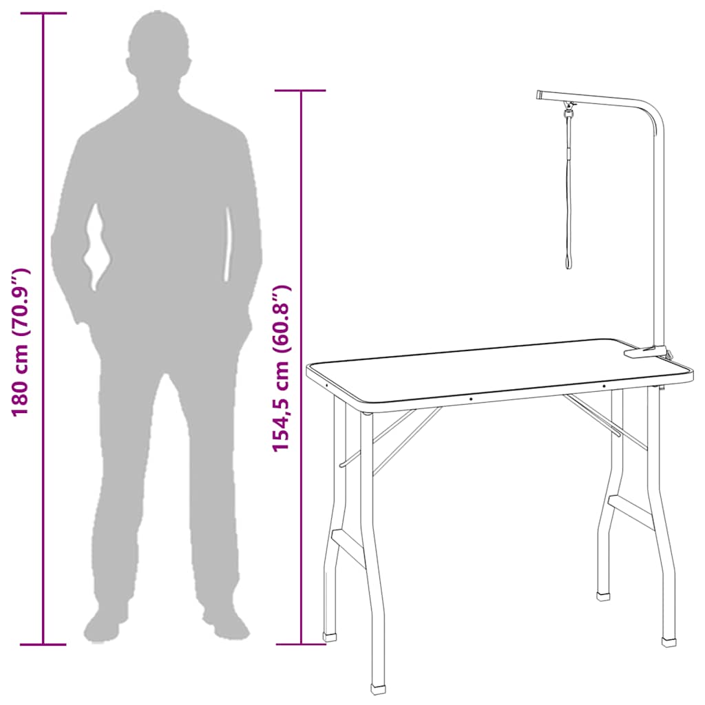 Această masă de toaletare este perfectă pentru cei care îngrijesc câini acasă sau în deplasare, pentru expoziții de câini etc. Are un blat antiderapant și un cadru din fier vopsit electrostatic, cu un braț de îngrijire reglabil și un laț.