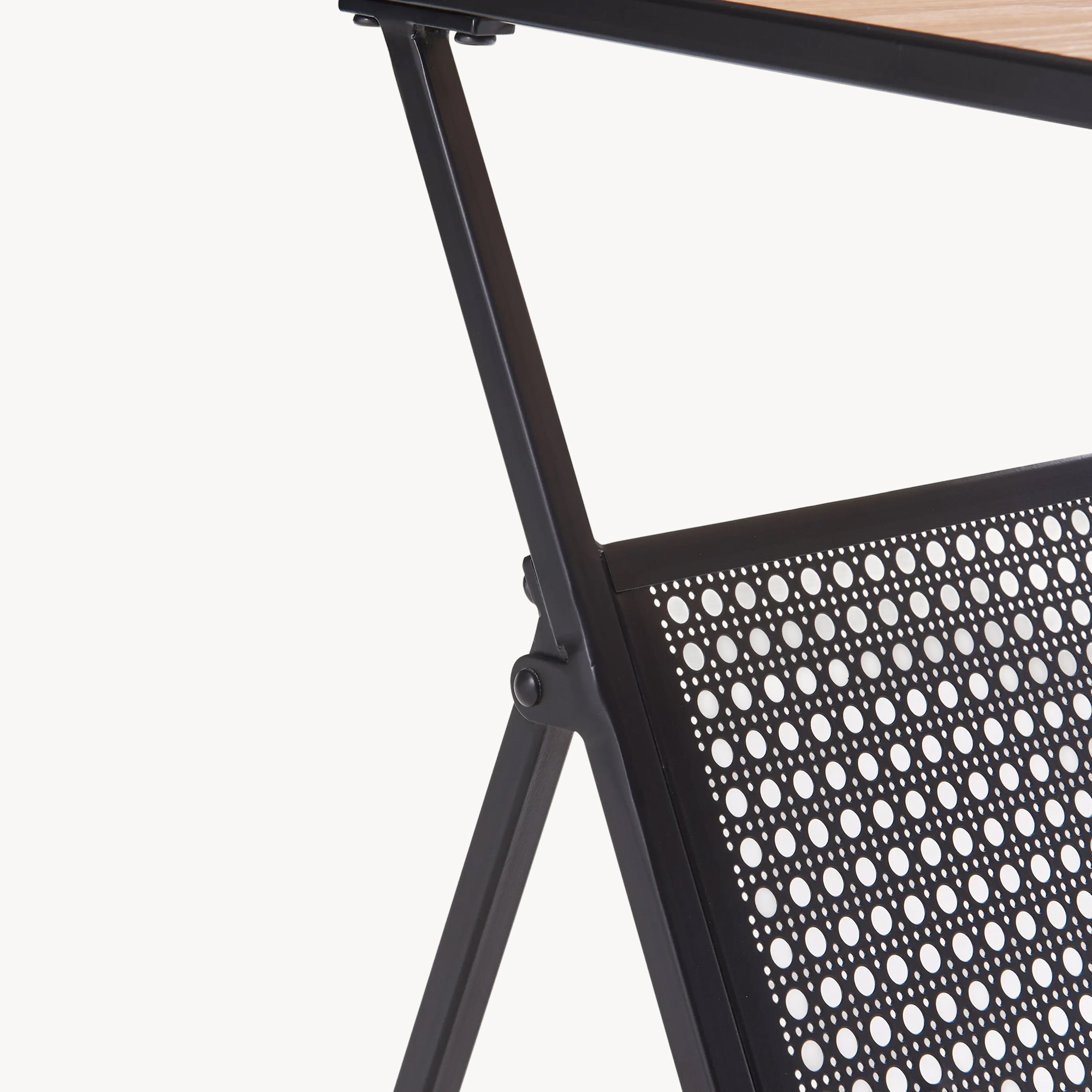 Datorită suportului pentru reviste integrat, ai la îndemână cărți, reviste sau pliante, păstrând în același timp zona ordonată. Blatul în aspect de stejar adaugă o notă caldă și naturală, iar cadrul metalic negru completează un stil contemporan, ușor de integrat în diverse amenajări.