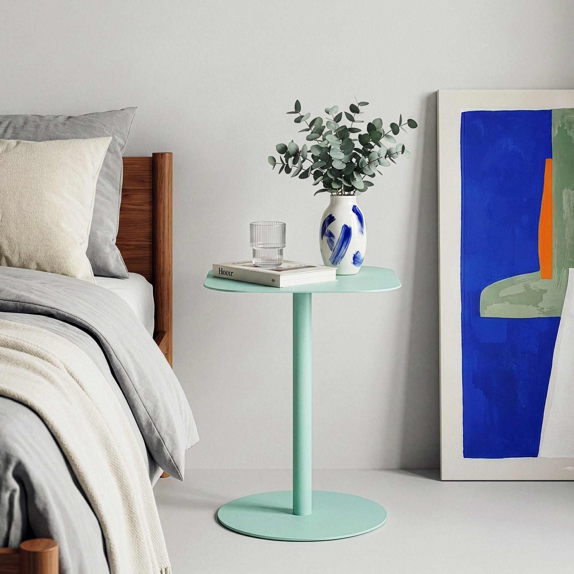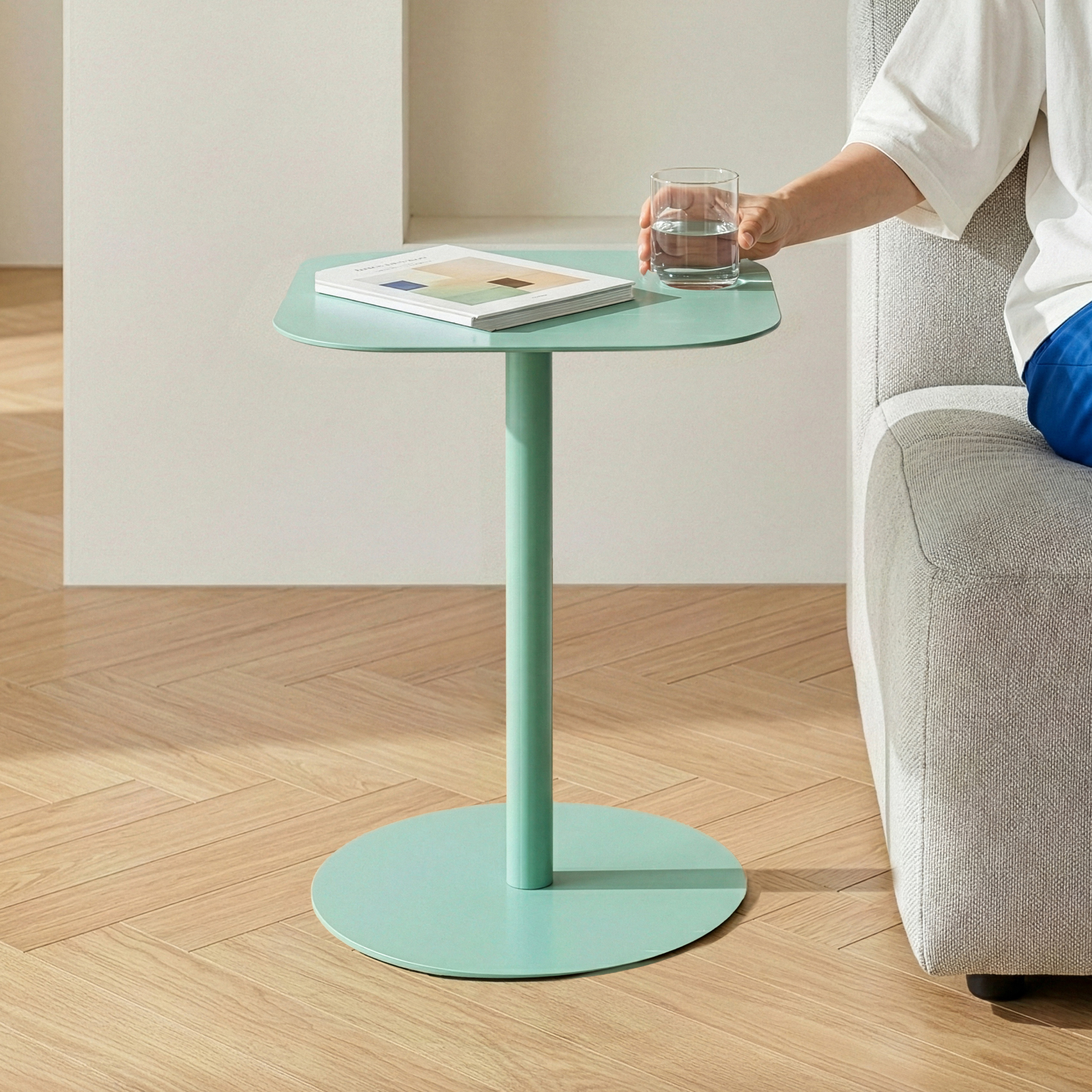 Masă laterală practică și elegantă, ideală pentru amenajări moderne, minimaliste sau clasice. Cu un design compact și o nuanță plăcută de verde mentă, această masă laterală din metal adaugă un accent decorativ discret și util în orice încăpere.