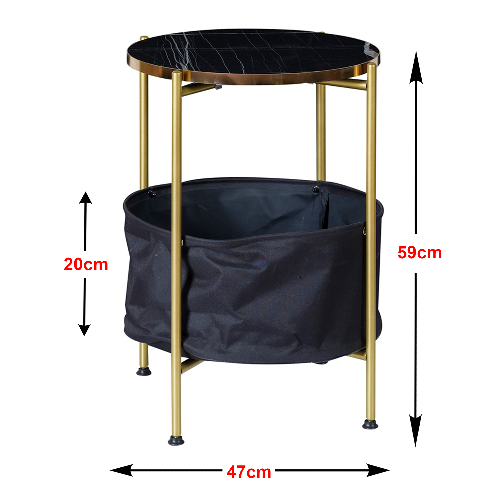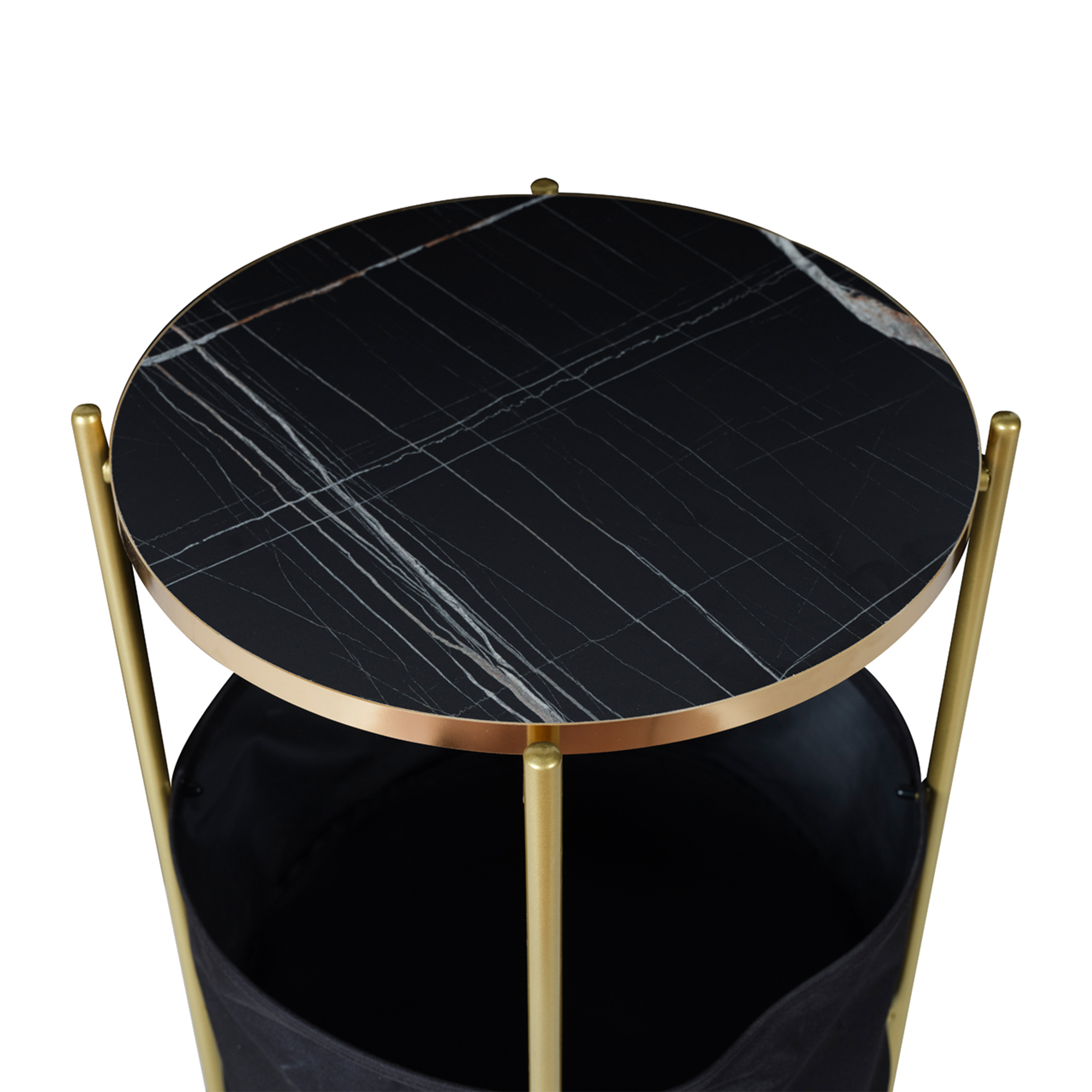 Masă laterală Suonenjoki – o piesă practică și elegantă, perfectă pentru amenajări moderne, glam sau contemporane. Cu un blat în aspect marmură neagră și cadru metalic auriu, această masă laterală adaugă stil în living, dormitor sau colțul de relaxare.